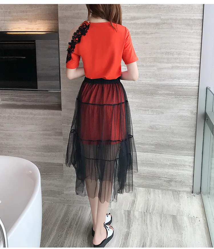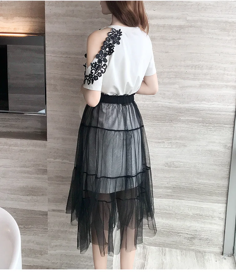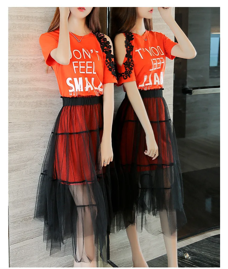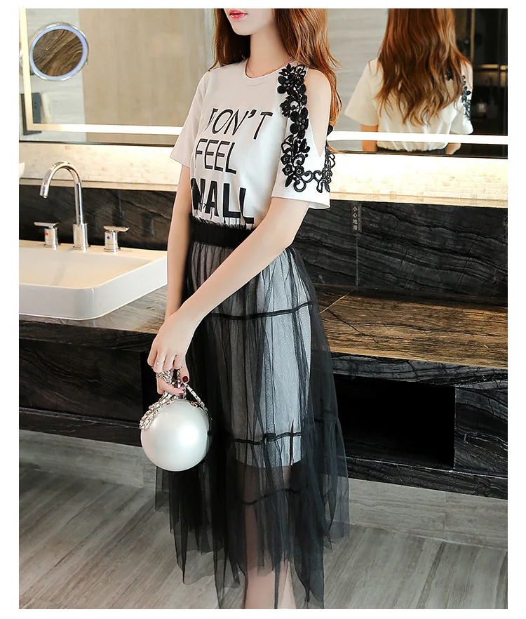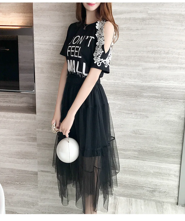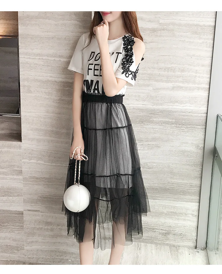Женский комплект из 2 предметов, хлопковое кружевное платье-футболка с открытыми плечами + сетчатая Прозрачная Юбка, милый сарафан с буквенным принтом, лето