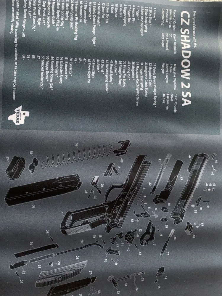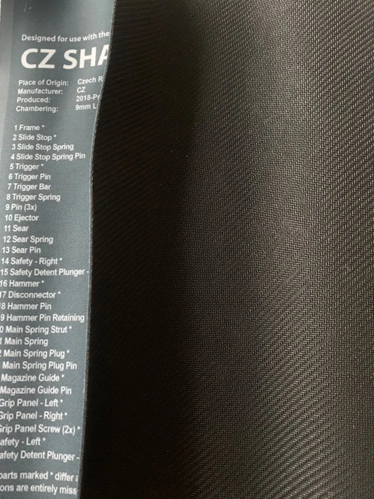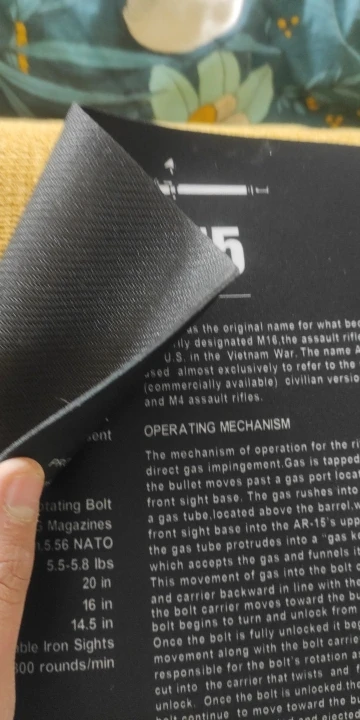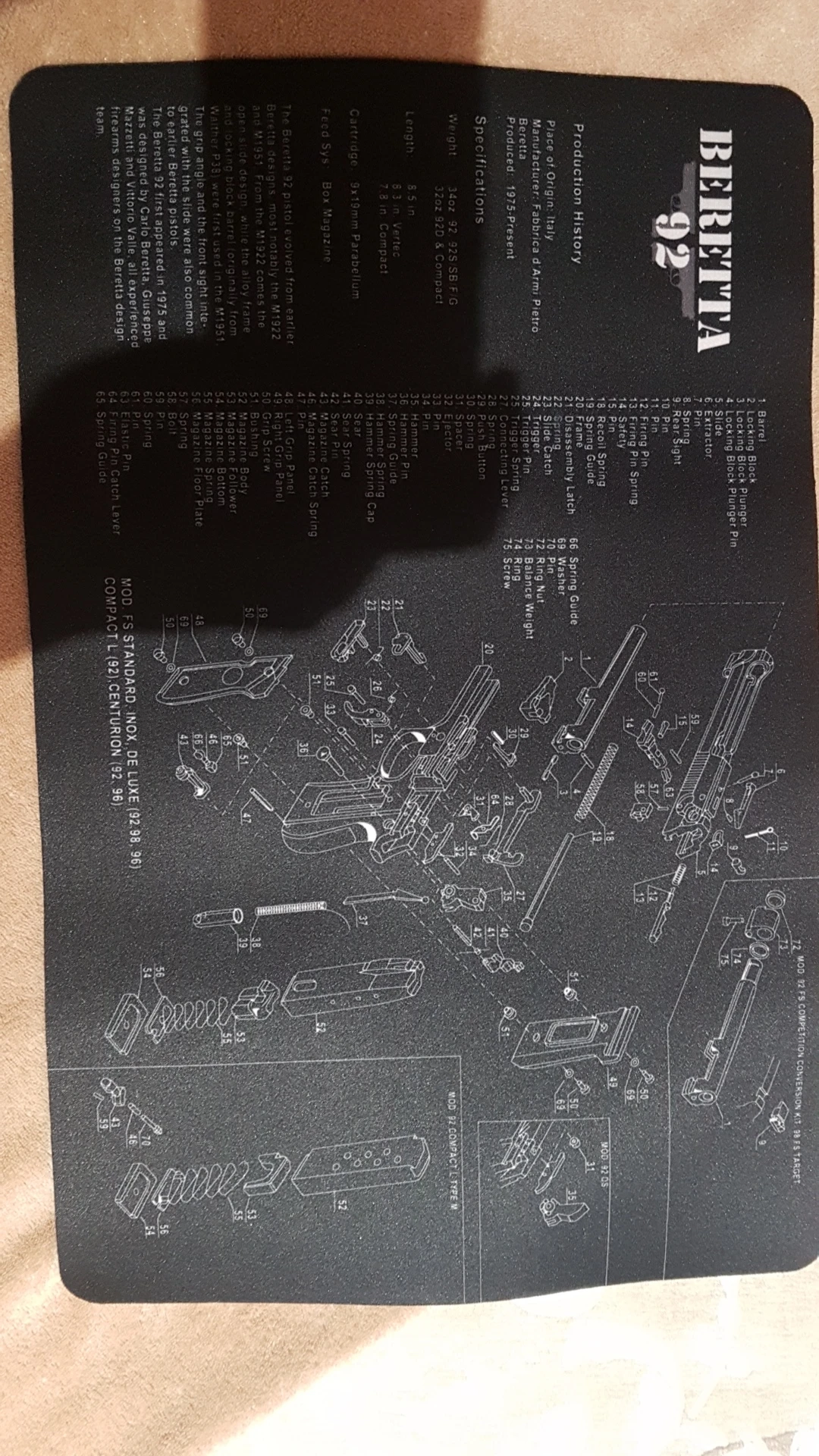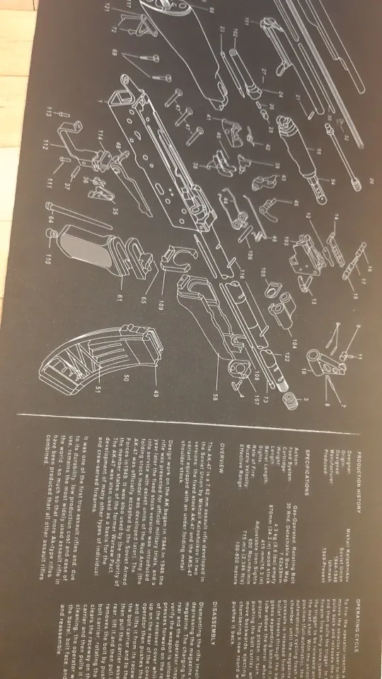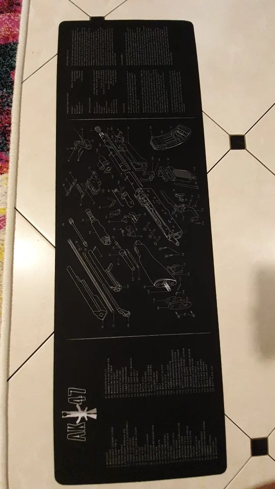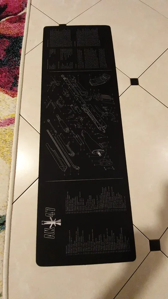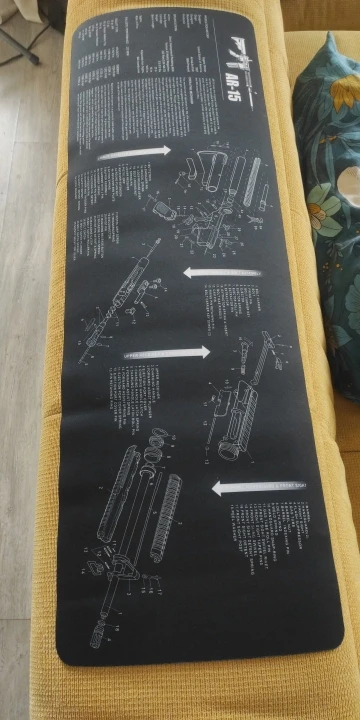 Выглядит хорошо, как на картинке. Он довольно большого размера и изготовлен из хорошего прорезиненного материала и имеет хорошее изображение разборного ar и список всех частей с фотографиями. Хорошая большая рабочая подушка. Идеально подходит для работы/очистки вашего ar. С списком деталей вы можете снять ar до последней гайки и болта...