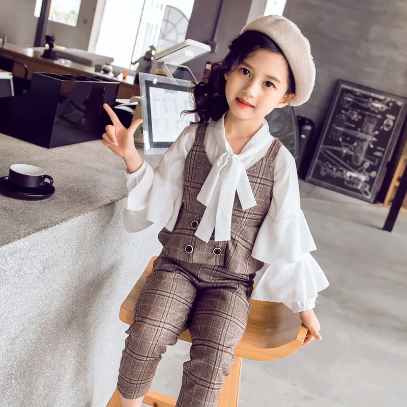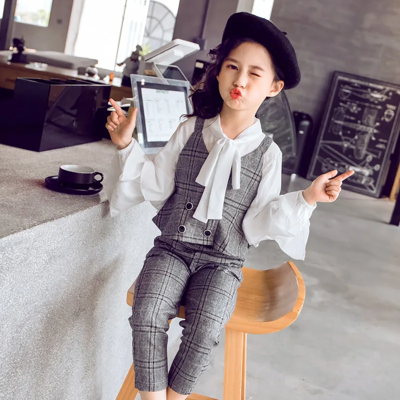Комплект детской одежды из 3 предметов, футболка с длинным рукавом и бантом, клетчатые брюки и жилет, комплект детской одежды, костюм для маленьких девочек, 2019