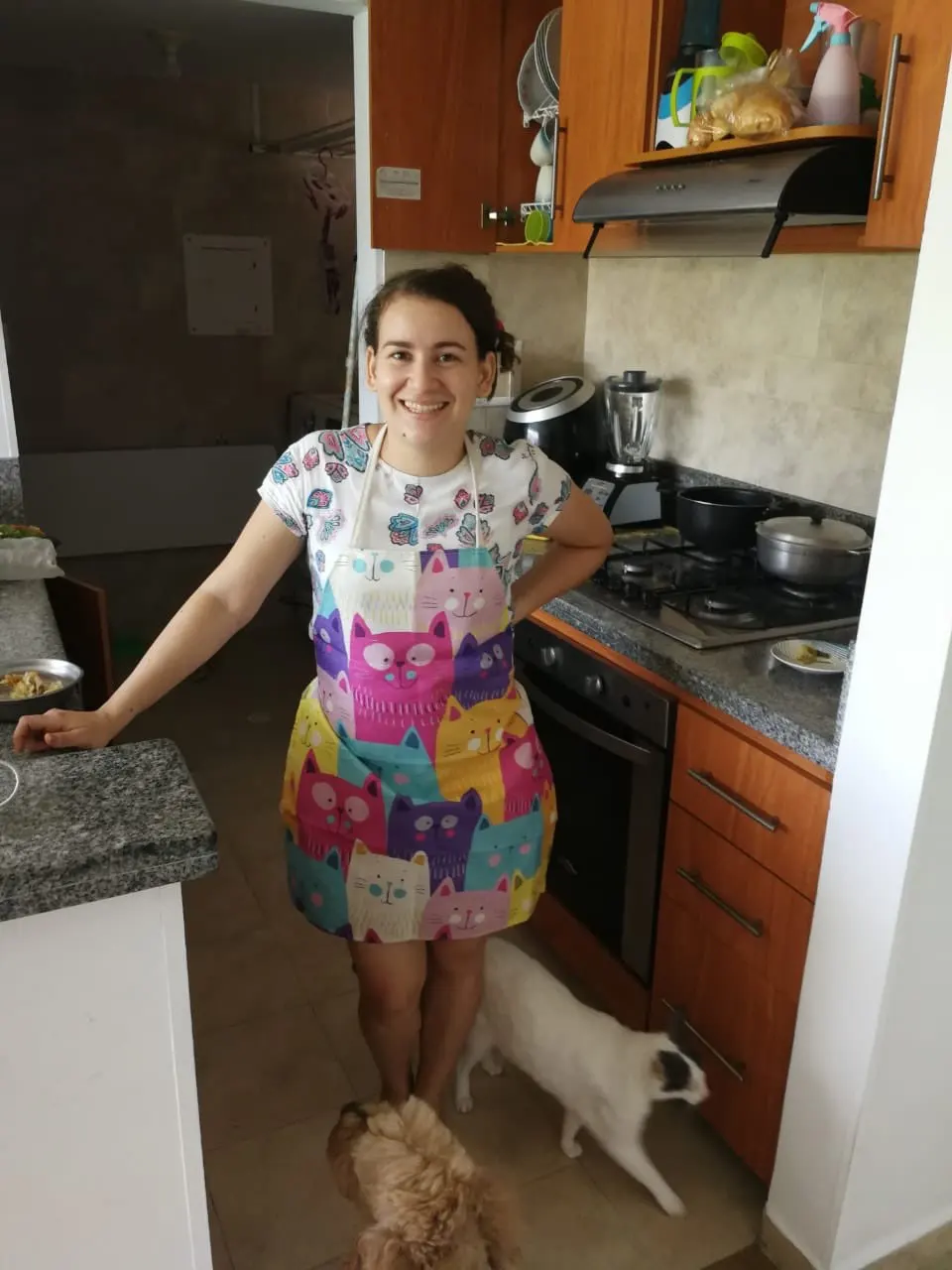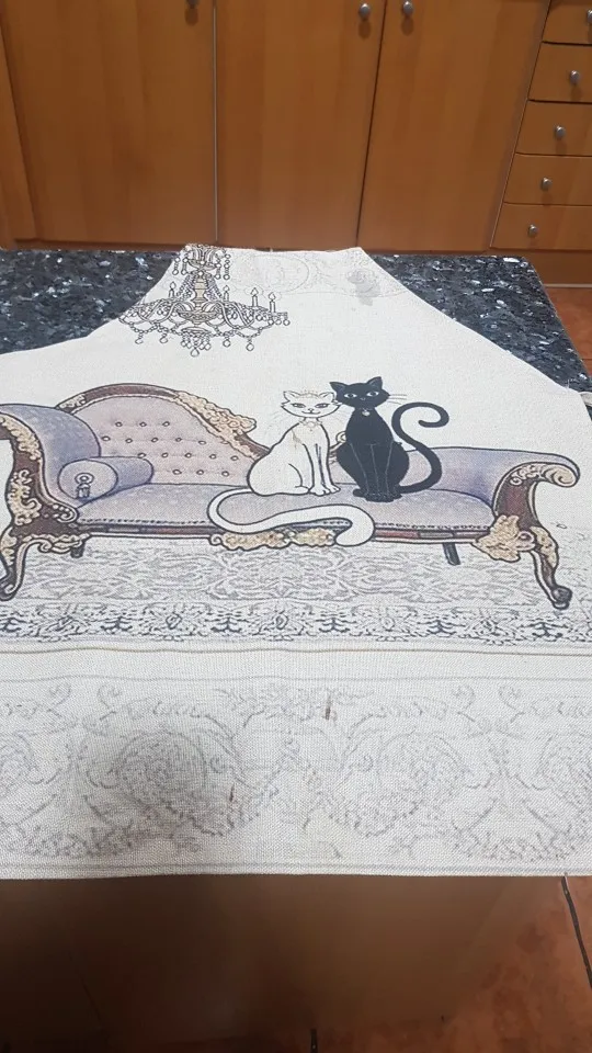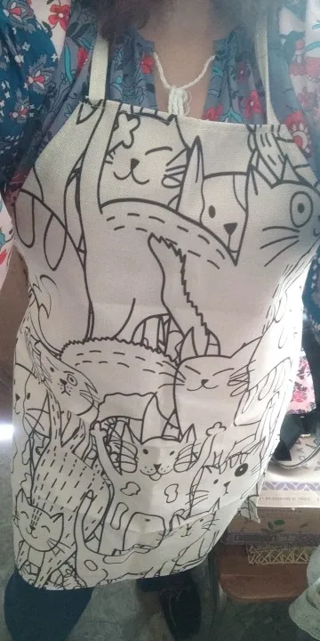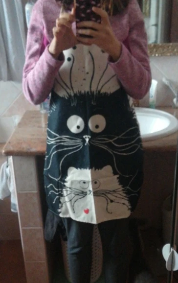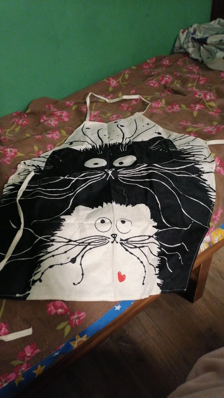 Катастрофически долгая доставка: почти два месяца. Сам фартук довольно плотный и неплохой, котики забавные, но нитки торчат кругом.