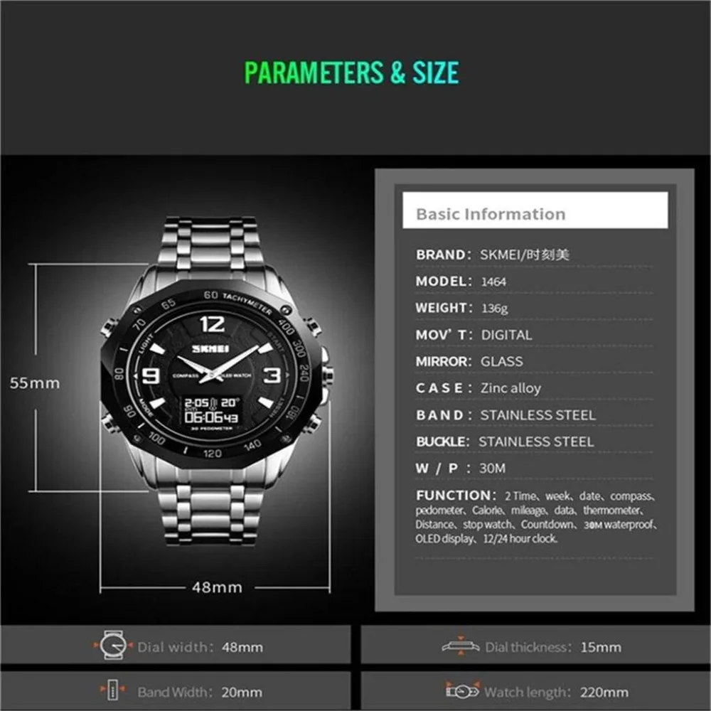 SKMEI Top Роскошные модные спортивные часы, мужские 5Bar водонепроницаемые часы из нержавеющей стали ремешок цифровые часы reloj hombre 1335 USD 15,99Долларов США/шт