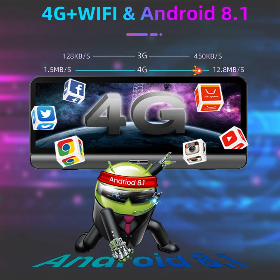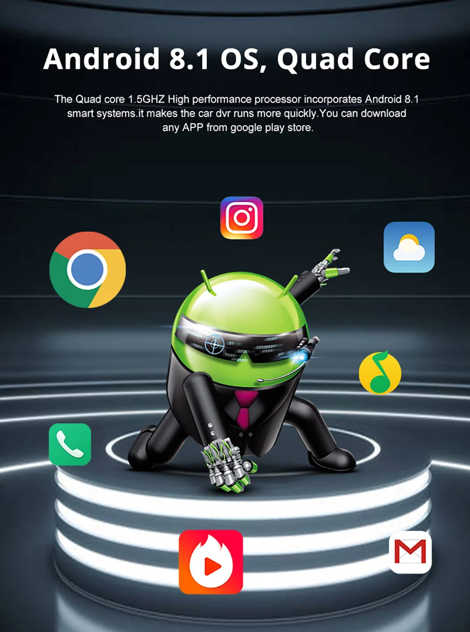 Более Оперативная память, более Встроенная память, Бег, по крайней мере, 50% быстрее. Quad core 1,5 ГГц высокопроизводительный процессор включает Android 8,1 интеллектуальных систем. Это делает Автомобильный видеорегистратор более быстрым. Вы можете скачать любое приложение из магазина google play.