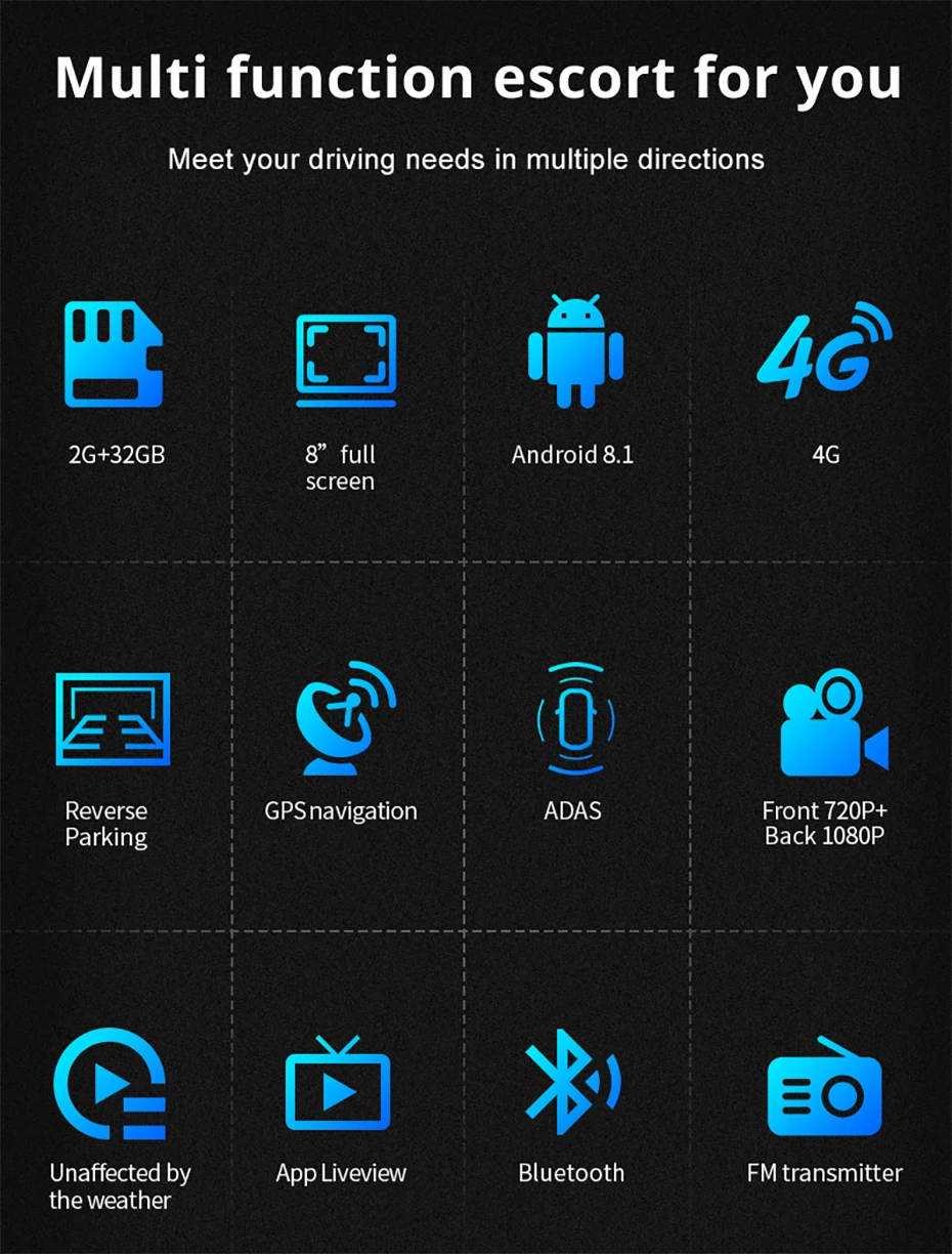 Встроенный Wi-Fi позволяет оставаться на связи на ходу и быстро просматривать веб-сайты. GPS карта, фильмы, музыка и приложения могут быть предварительно загружены, когда доступен бесплатный WiFi.Не только Автомобильный видеорегистратор подключается к Wi-Fi, но и может быть горячим WIFI для вашего другого устройства, когда Автомобильный видеорегистратор поставляется с интернетом на sim-карте 4G.