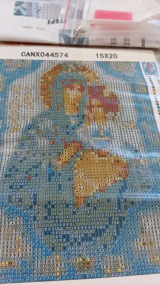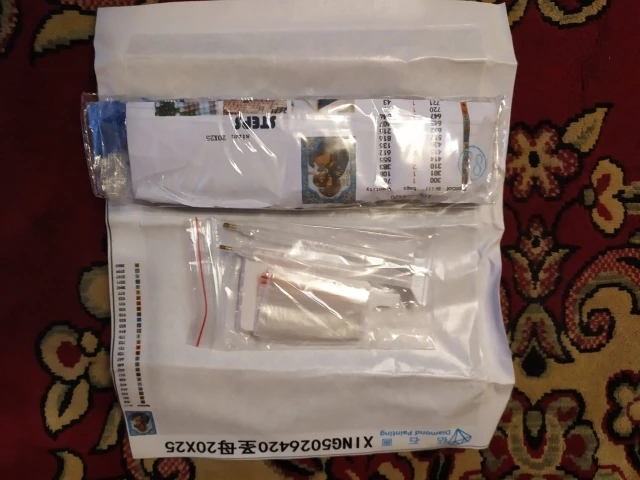 Не запечатлела момент получения. Все упаковано. Сама картинка изрядно принята. Вроде как всё пришло, в процессе работы точно всё пойму, все ли стразы высланы. Цвет страх соответствует описанию. Высылаю фото начала работы