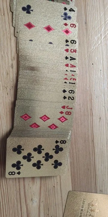 Посылка шла долго,но ладно. Сами карты красивые, яркие, это приятно, но коробочка ужасна. Сбоку она склеена просто двусторонним скотчем, поэтому она конечно же отклеивается и поэтому выглядит так убого. Попробую потом придумать как ее склеить нормально. И обидно, что на коробке нет никакого рисунка, эмблемы или надписи...Кое-где на картах присутствуют небольшой брак (какие-то пятнышки словно их механически немного повредили( на 4 фото видны золотые пятна), так же забавно, но два джокера разного размера...вряд ли так было задумано. Ещё немного обидно, что только один туз с интересным узором( 5 фото), все остальные с обычным. Не играли ещё в карты этой колодой, но возможно из-за того, что они скользкие, карты могут выпадать из рук. Возможно не всех это интересует, так как такие карты даже просто здорово купить себе в коллекцию. Итог: коробочка не очень, карты неплохие, думаю, своих денег это стоит.