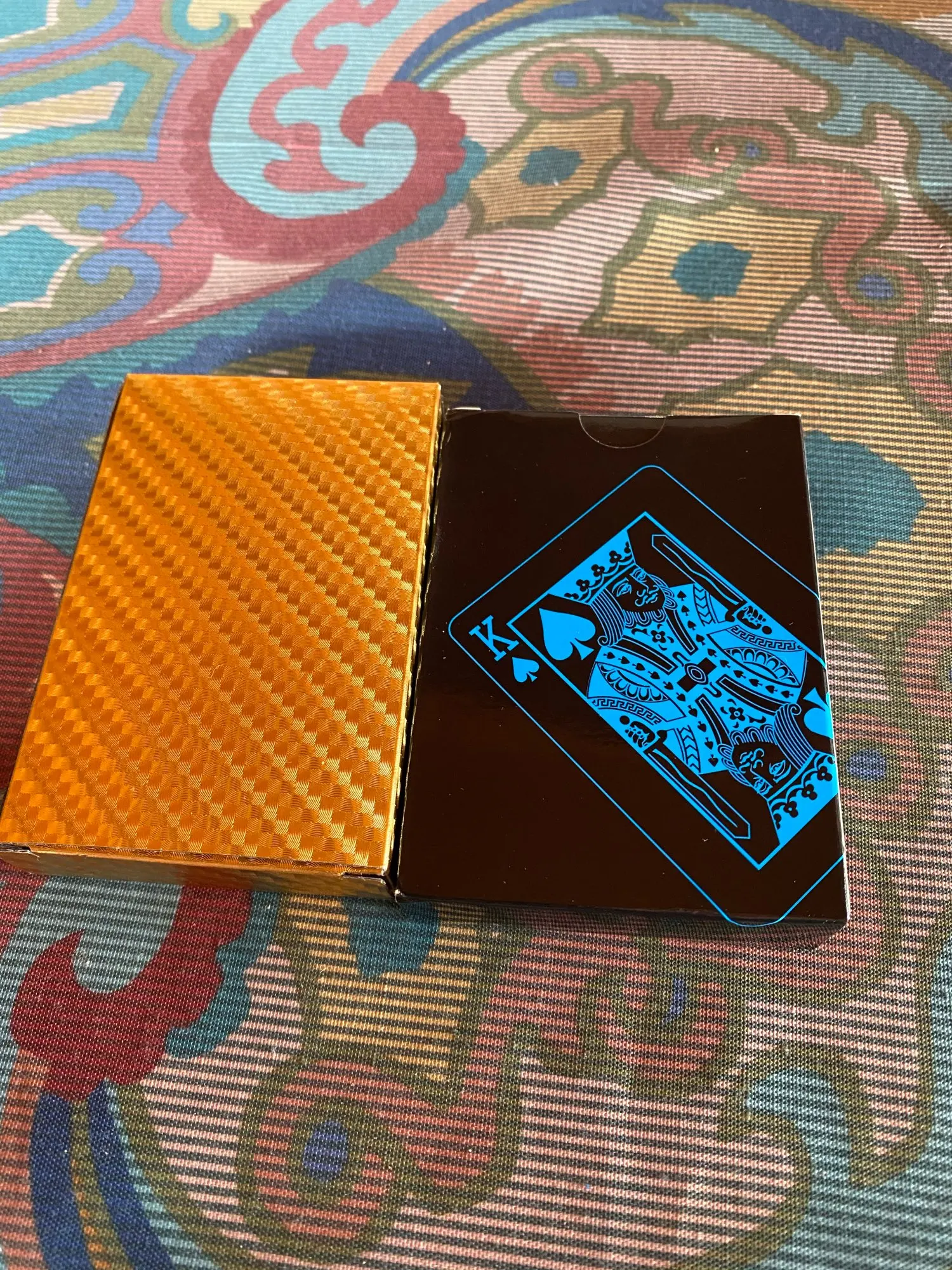 Отличные карты! Они поставляются в золотой пластиковой коробке, и карты также пластиковые. Они имеют блестящую золотую переднюю часть и геометрическую золотую заднюю часть. Стоит того!