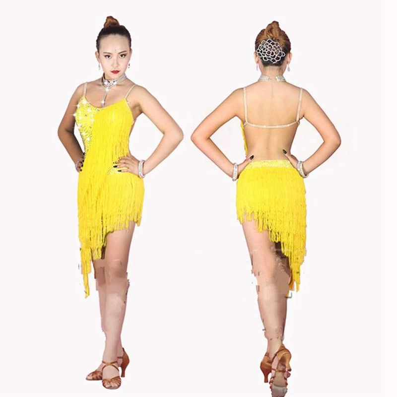 Женское платье для латиноамериканских танцев, плотное желтое платье с блестящими кристаллами, отделанный бахромой латинский