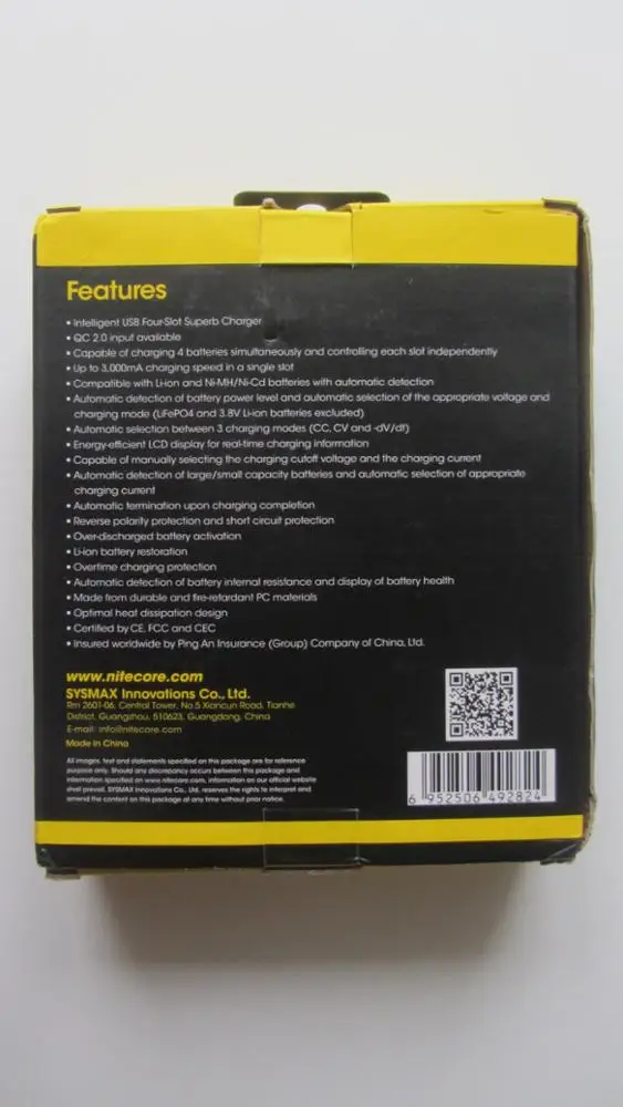 Зарядное устройство Nitecore является подлинным, и упаковка была идеальной. Работает как очарование, как Nitecore. QC-USB источник питания работает (значок для быстрой зарядки включен на зарядном устройстве Nitecore)