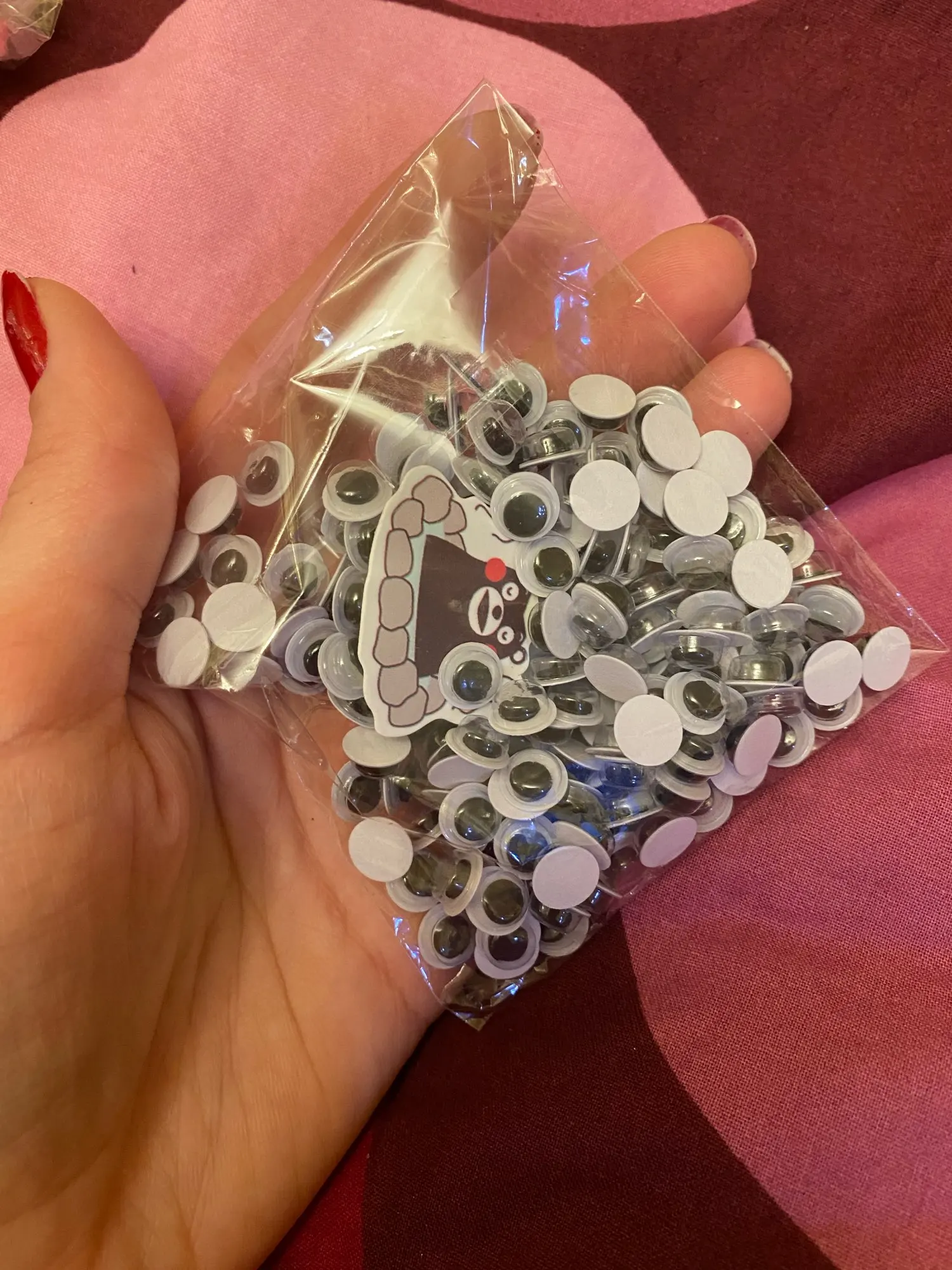 пришел пакетик, глазки все разные размеры. очень долгая доставка без отслеживания, валялся где-то на постах, найти не могли, пока спор не открыла.