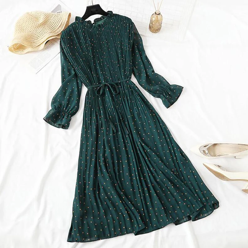 Женское шифоновое плиссированное платье, повседневное Свободное платье с длинным рукавом, Расклешенным рукавом и оборками, весна 2020