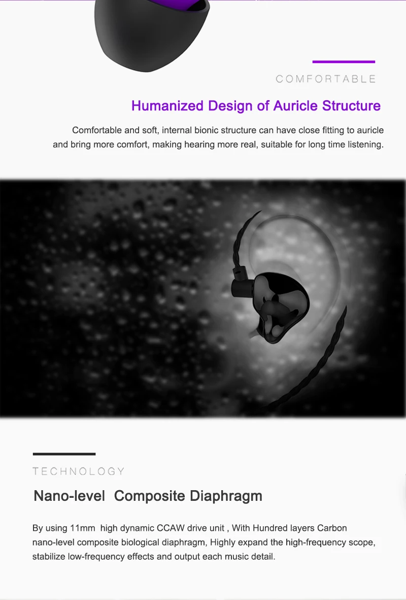 2 Pin/0,78 мм съемный кабель2pin/0,78 мм интерфейс, для разных любителей музыки, обеспечивают лучшую масштабируемость и совместимость в соответствии с их собственными предпочтениями, значительно улучшая производительность VS3.Гуманизированный дизайн структуры ушной раковиныУдобная и мягкая, внутренняя бионическая структура может плотно прилегать к ушной раковине и приносить больше комфорта, делая слухи более реальными. Подходит для длительного прослушивания.Наноуровневая композитная диафрагмаИспользуя 11 мм высокодинамический блок привода CCAW, со ста слоями углеродистой наноуровневой композитной биологической диафрагмы, высоко расширяйте высокочастотный диапазон, стабилизируйте низкочастотные эффекты и выводите каждую музыкальную деталь.