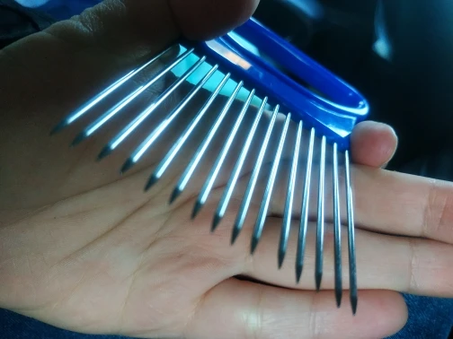 Заказала 11.11, пришла посылка, 01.12, на вид очень качественно сделано, на зубья одеваеться пластмассовый колпачок, сами зубья очень прочные и острые, есть некоторые изъяны, пластмаска в некоторых местах торчит, но это не принципиально, ещё не пробовала, но надеюсь все будет ок, продавцу спасибо и рекомендую