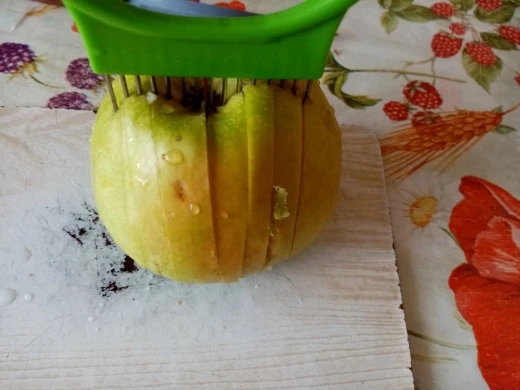 штука интересная, но не сильно практичная, те иглы которыми надо втыкать и держать, очень мягкие они и гнутся легко. Потому ровные ломтики вы не получите, но порезать можно все до самого конца, в этом удобство.
