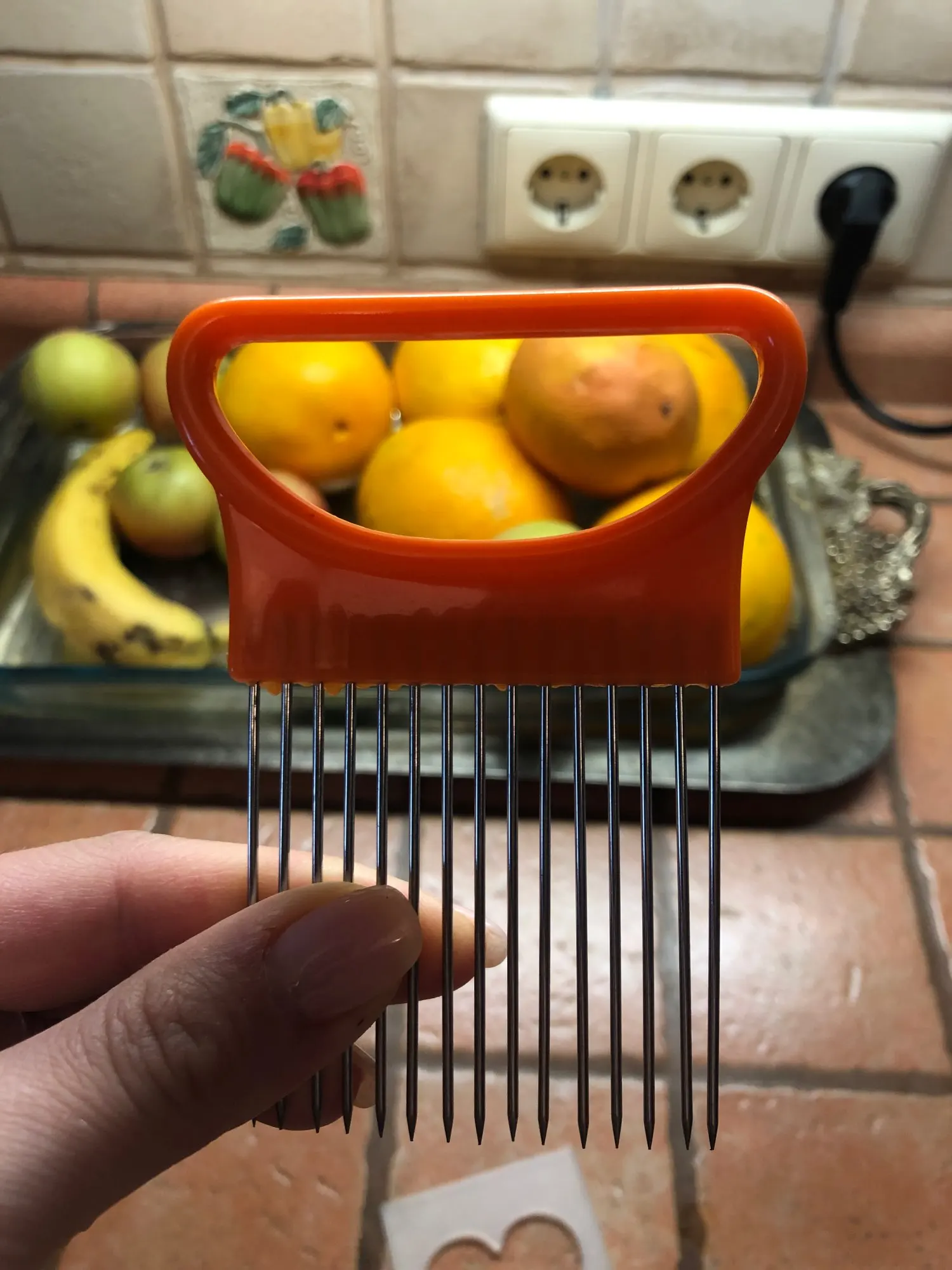 Продавец вместо белой прислал оранжевую! Штука нужная для тех кто как я ненавидит резать лук из-за того что он разваливается!