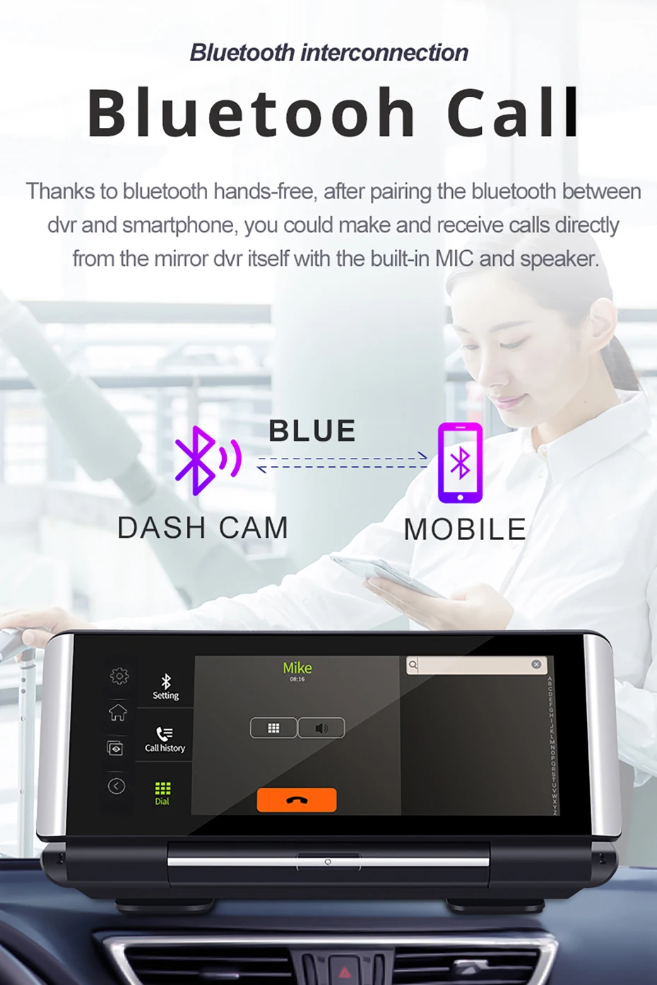 Благодаря bluetooth hands-free, После сопряжения bluetooth между видеорегистратором и смартфоном, вы можете совершать и принимать звонки непосредственно с самого видеорегистратора со встроенным микрофоном и динамиком.