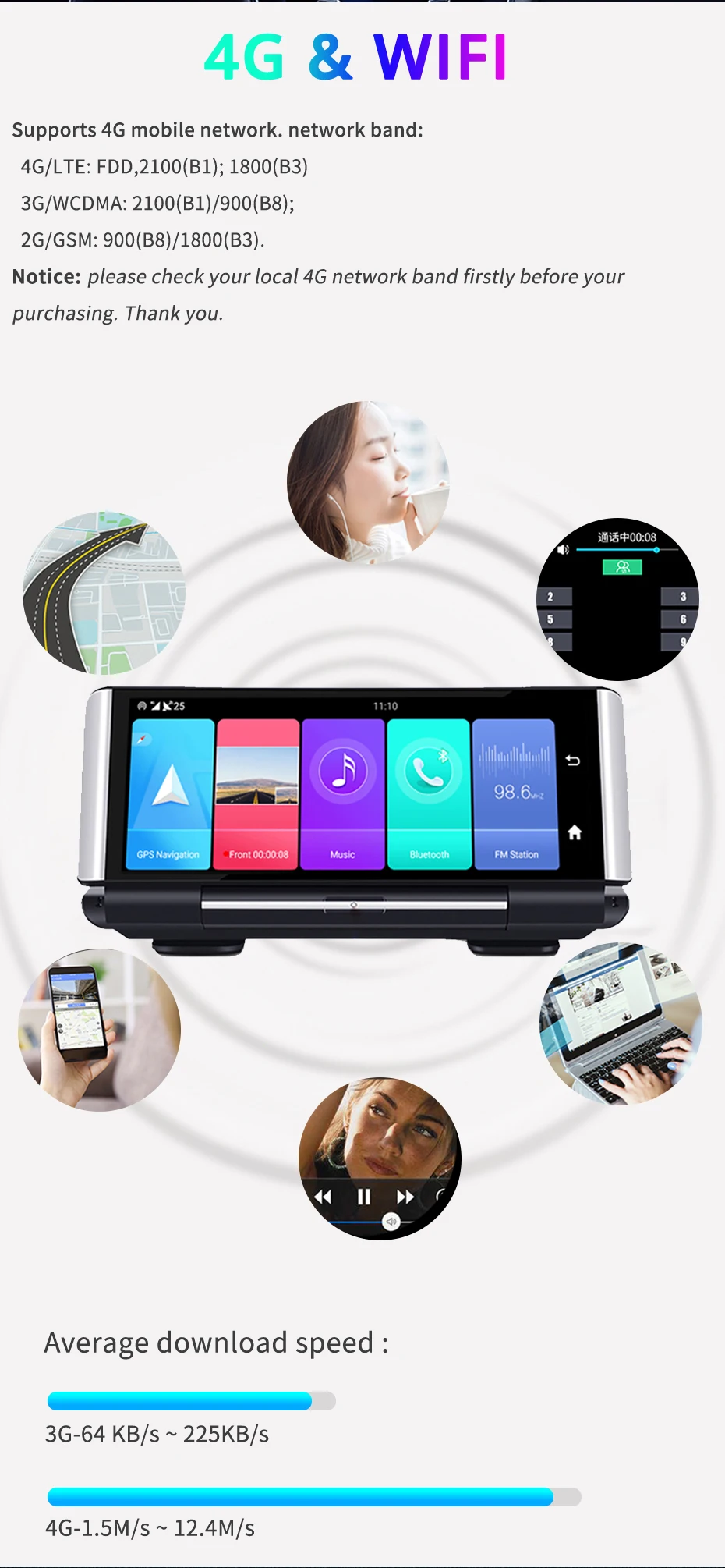 Начните Интернет-серфинг 4G с нашим видеорегистратором, он построен в горячих точках Wi-Fi, будет синхронизировать и передавать данные в Интернете на ваш смартфон, наслаждаться чтением, навигацией, музыкой онлайн для удовольствия.Примечания: Пожалуйста, вставьте вашу локальную micro sim-карту, которая поддерживает ниже сетевые полосы для интернет-серфинга 4G.4G -->LTE:FDD,2100(B1)/1800(B3)3G -->WCDMA:2100(B1)/900(B8);2G -->GSM:900 (B8)/1800(B3);
