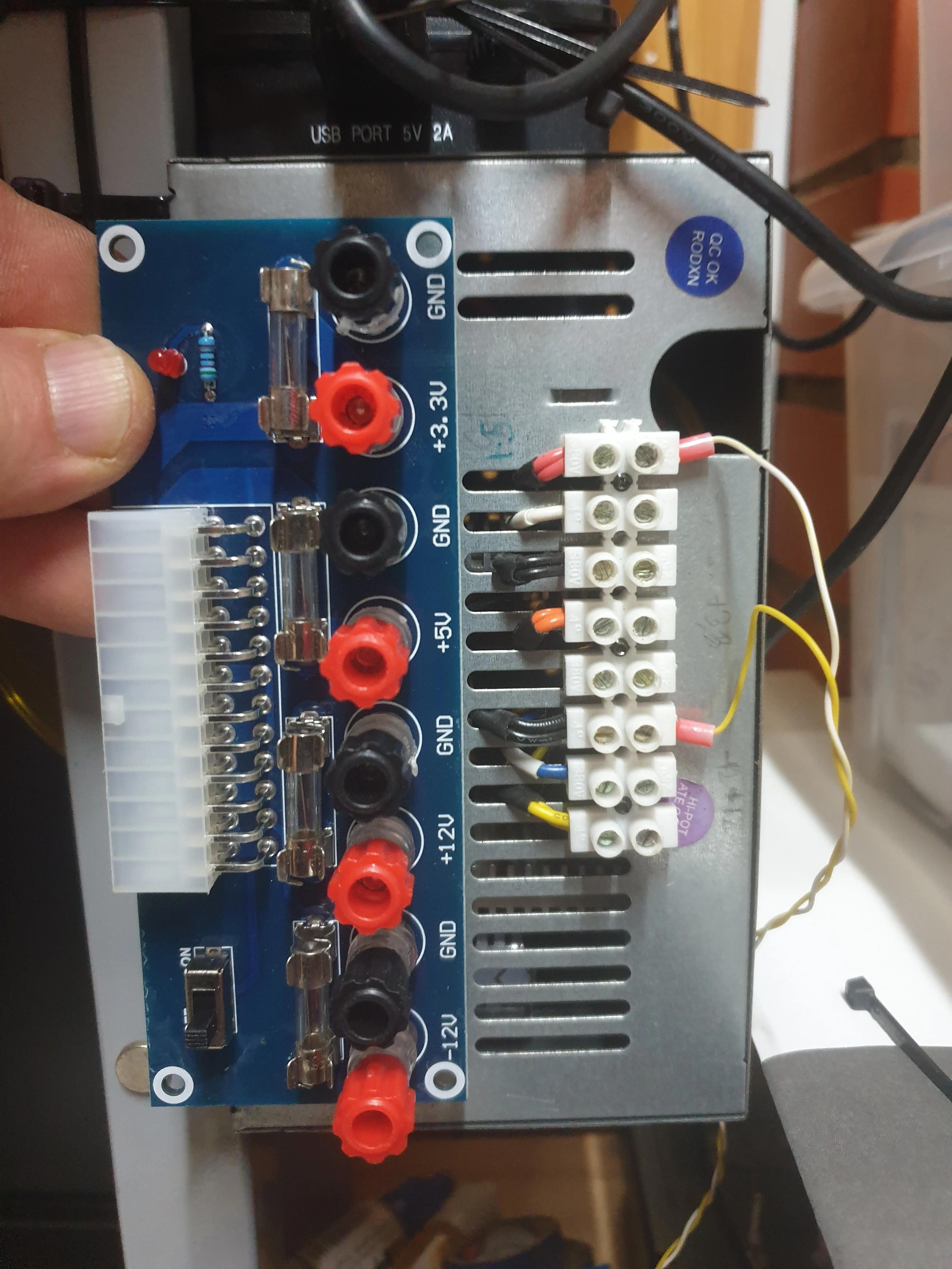 Разветвитель подошёл отлично к старому компьютерному блоку питания. Единственный минус - нижняя часть клеммников электроводящая, желательно её чем-нибудь изолировать.