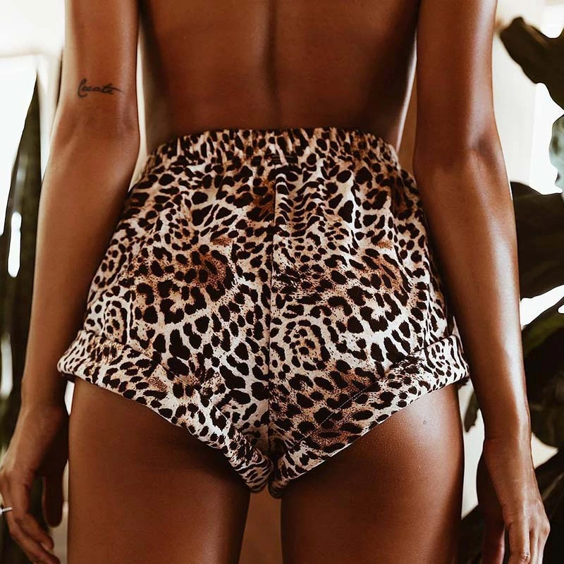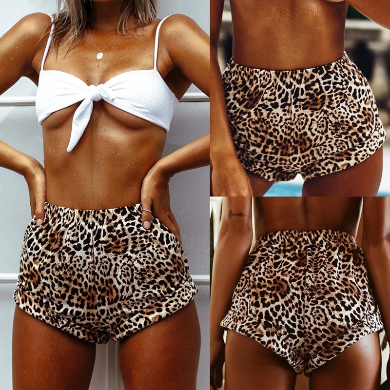 Летняя одежда, пикантные коричневые шорты с леопардовым принтом, эластичные с высокой талией, женские повседневные свободные короткие шорты, пляжная одежда
