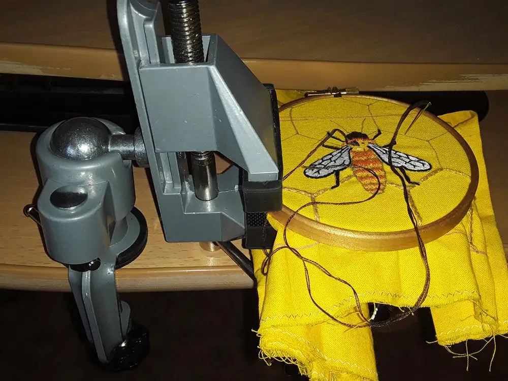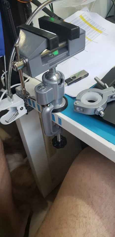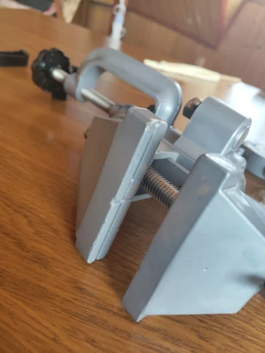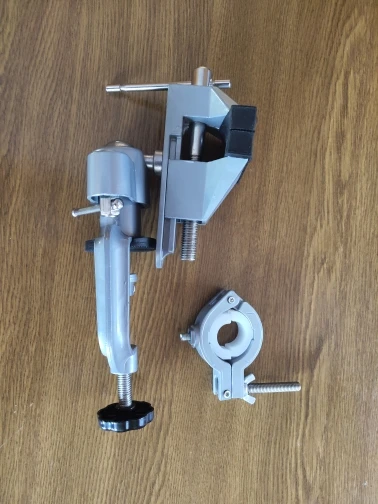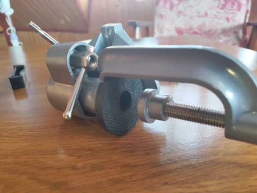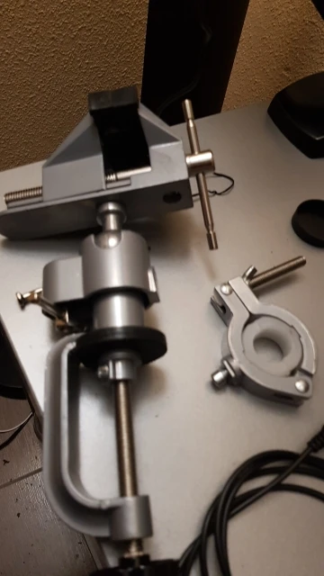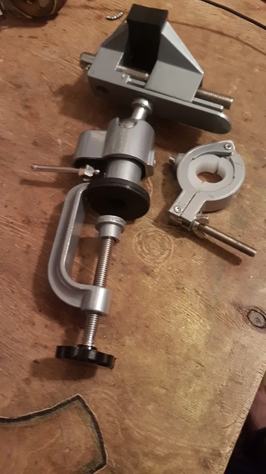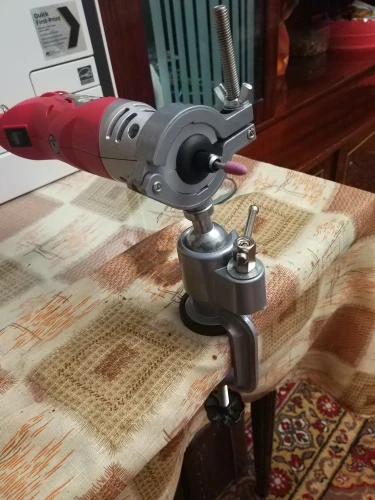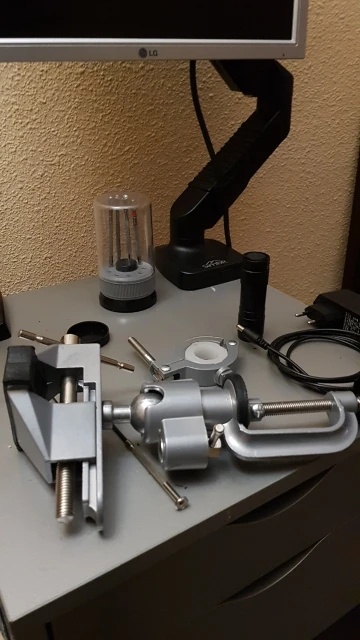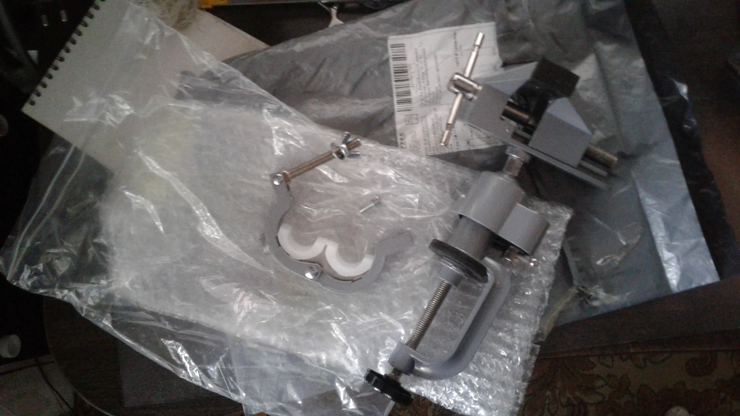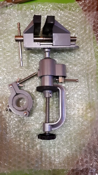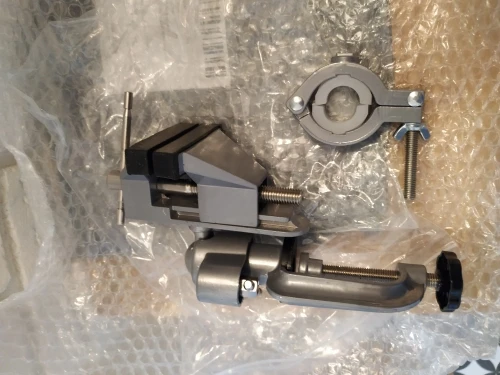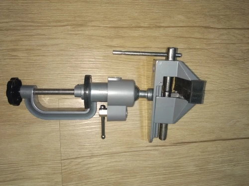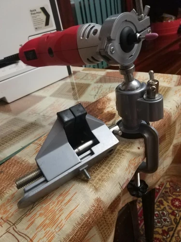 Качество этой штуки несколько разочаровывает. Я взял ради зажима для дрели и плюс тисочки бонусом. Однако, тисочки планировал использовать как отдельный съемный зажим. Но они для этого не очень подходят - снизу у них неровная поверхность, есть прямоугольный выступ и в итоге они не могут ровно стоять на плоской поверхности. Так же качество губок этих тисочков сильно так себе, обычно губки отдельно полируются, а здесь это все тот же покрашенный серой краской корпус. Кому пришло в голову красить губки краской? Она же отвалится, если что-то в них зажать. Что касается самого зажима, то к большей части электроинструментов он подошел. Дрель, наконечник foredom, отдельный электромоторчик - все это можно зажать. Но вот бормашинку hilda надежно зажать не получилось - нет подходящего участка корпуса.