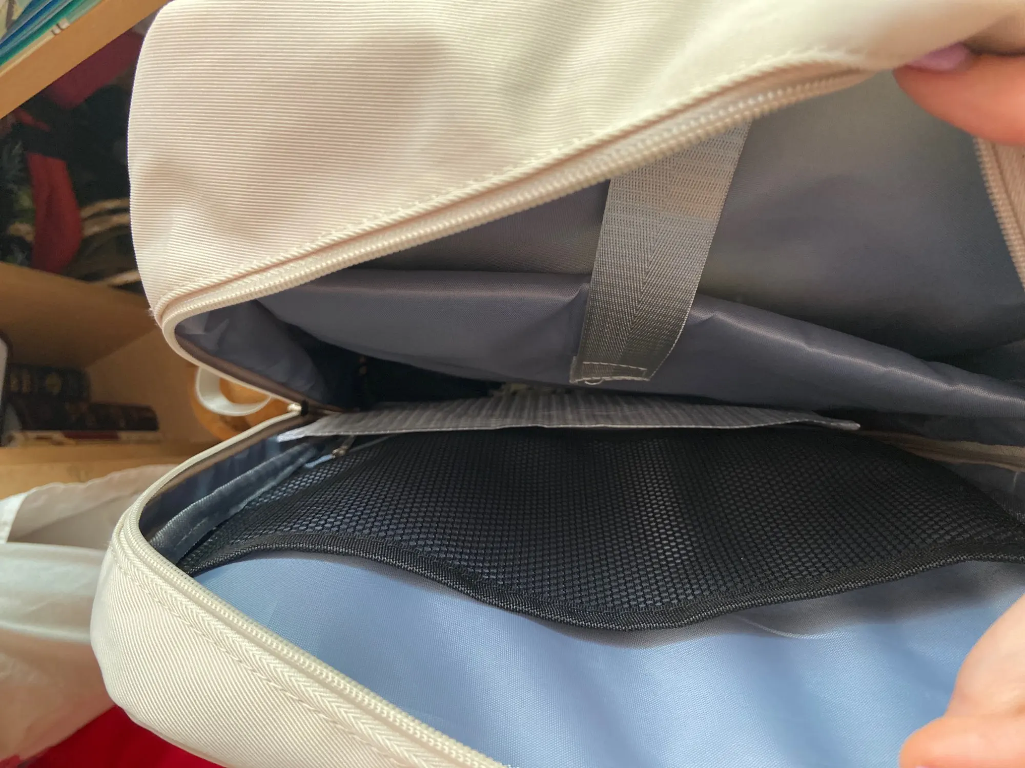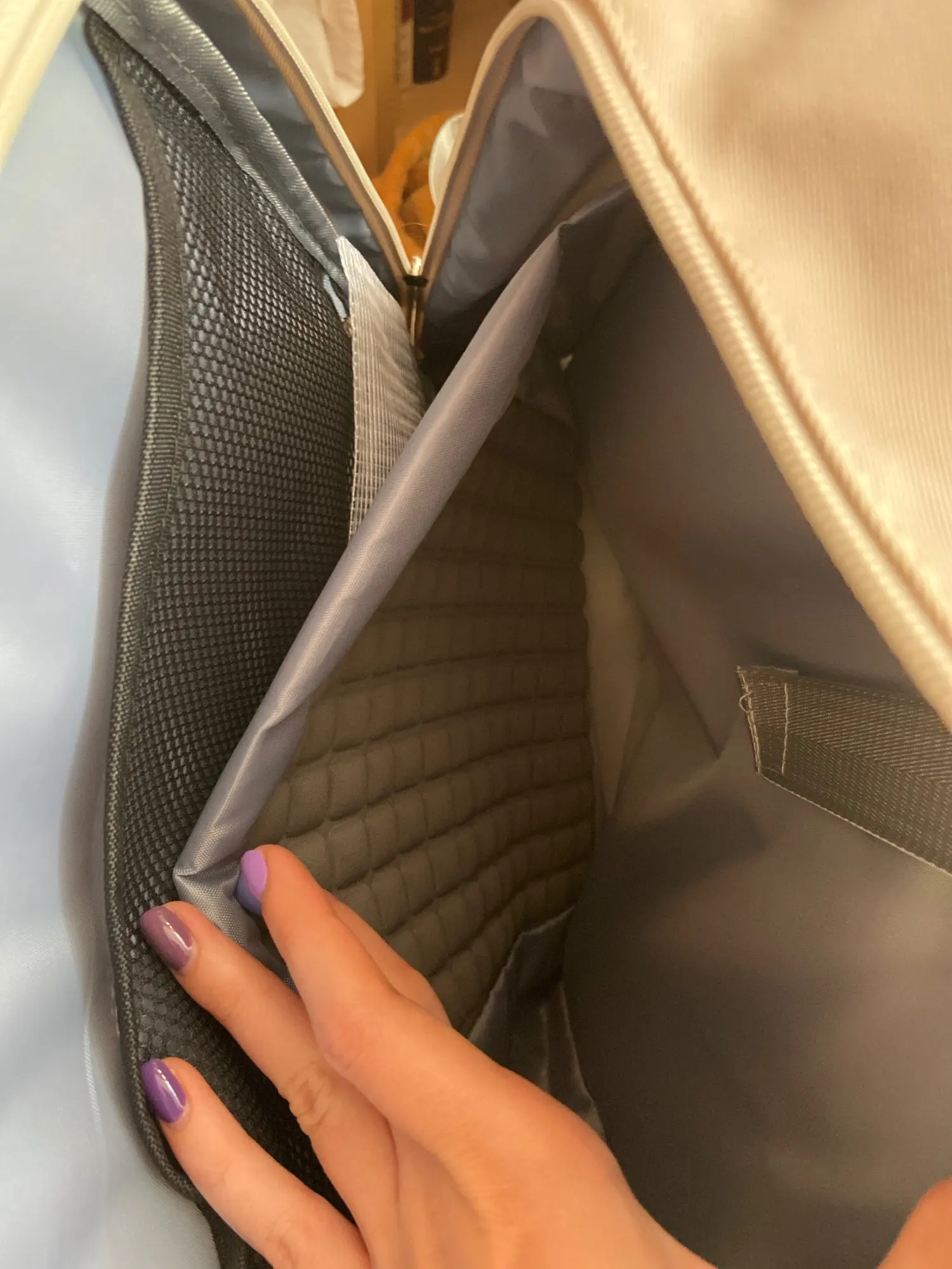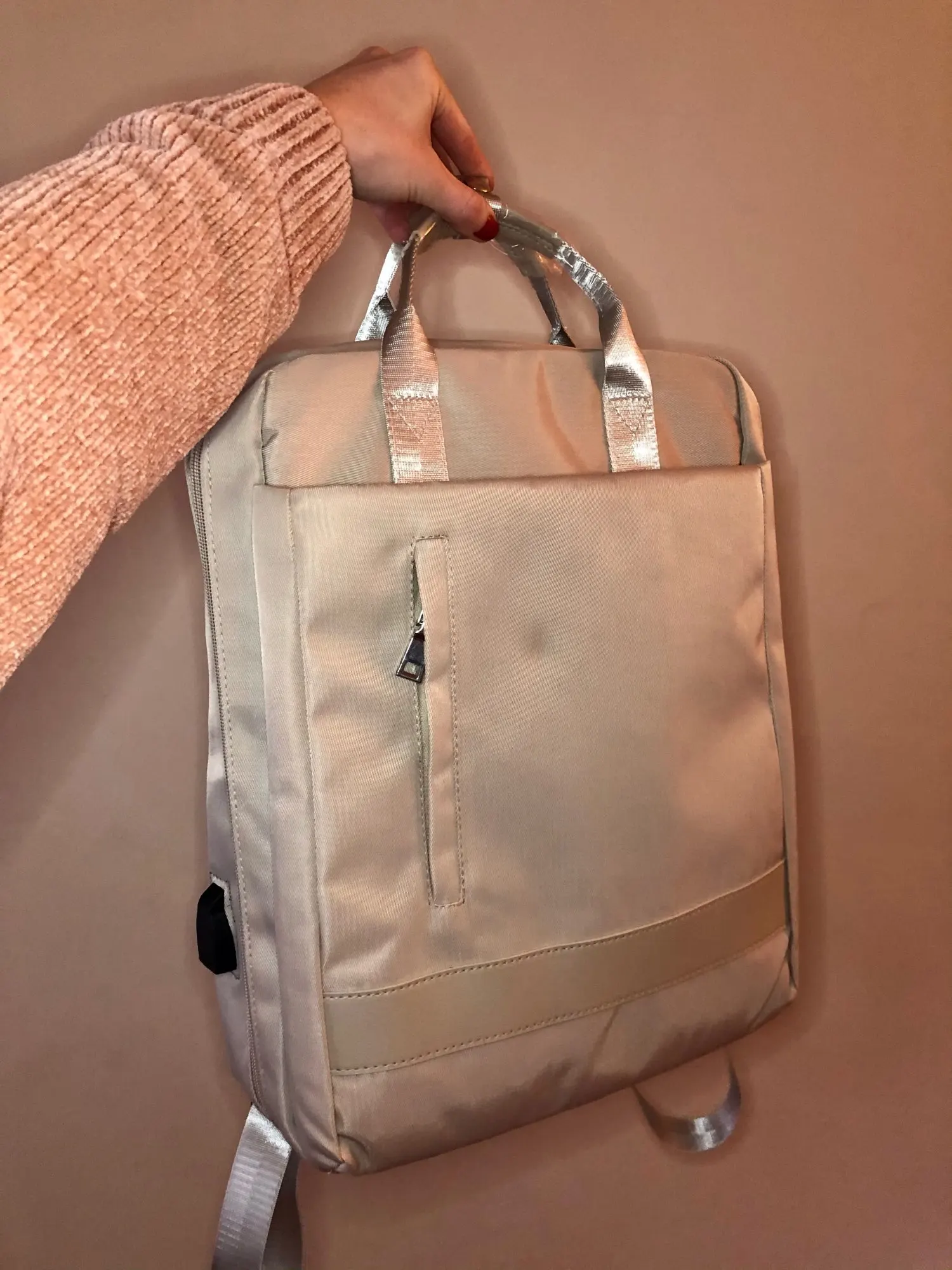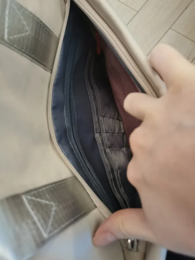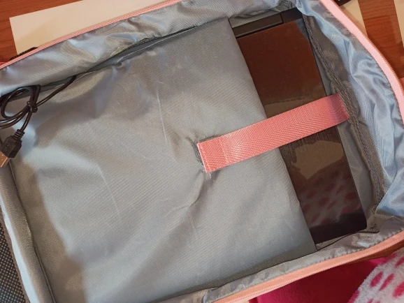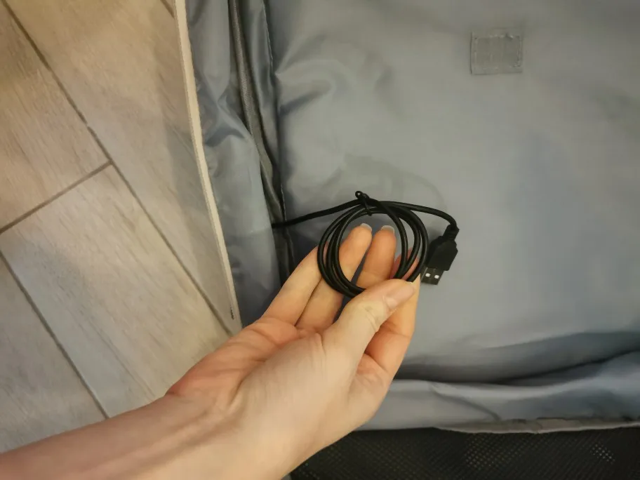 Пришло за месяц. Все очень качественно сшито, нитки не торчат. Много карманов внутри. Очень много вмещается. Ткань хорошая, очень гладкая, приятная на ощупь. Провод внутри работает.