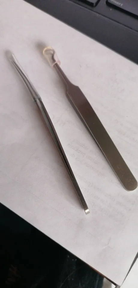 Пинцетики маленькие, ок.8 см в длину, очень острые, с неотшлифованными краями, пальцем чувствуются зазубринки на концах, при смыкании пинцета кончики разъединяются. Что-то выдавить ими на лице просто нереально. Они скорее подходят для работы с микросхемами, не более того.