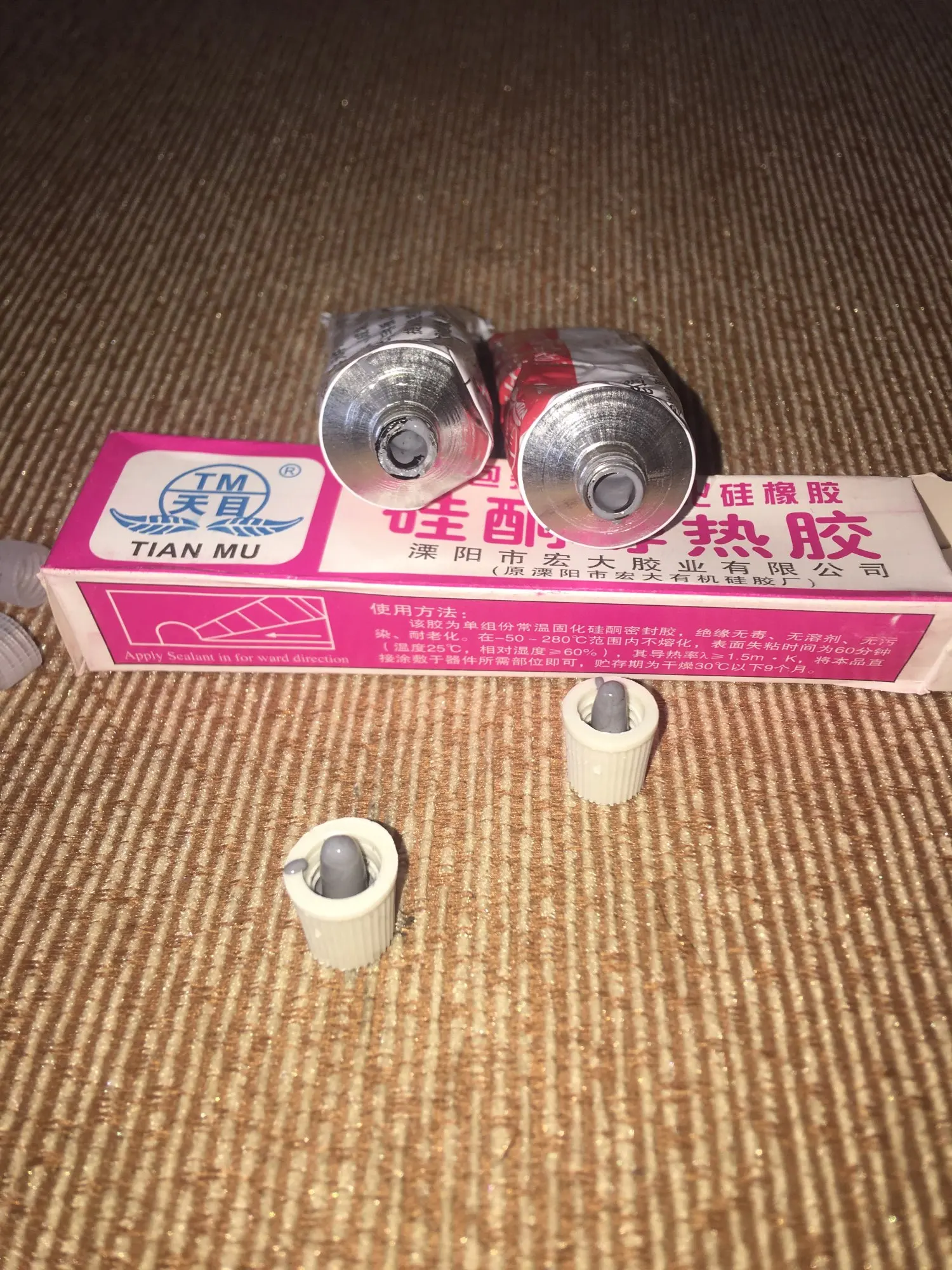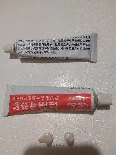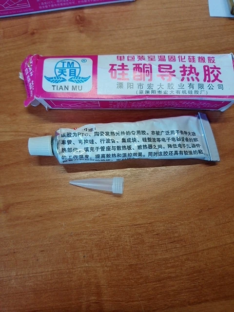 Пришло за полтора месяца. Очень много теплопроводящего клея 2 по 60 грамм. Это прямо много. Серого цвета. В коробке носик для тюбика. Сохнет хорошо, твёрдый, тепло проводит. Единственный минус очень помятые тюбики, прямо совсем помятые рваные коробки. Хотя были завёрнуты в пупырку в несколько слоёв. По пути помятся просто физически не могли, видимо это продают клей потерявший товарный вид ещё в Китае. Но всё равно очень хороший клей его реально много, выходит гораздо дешевле чем брать белый в маленьких тюбиках который ещё и высыхает со временем. Этот не высохнет прямо гарантированно в крышке есть уплотнитель. В общем хороший клей.