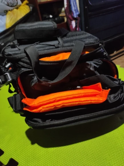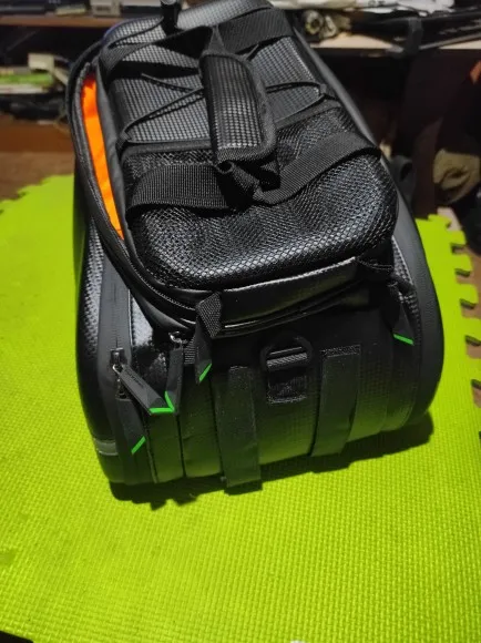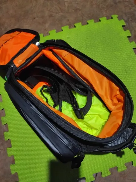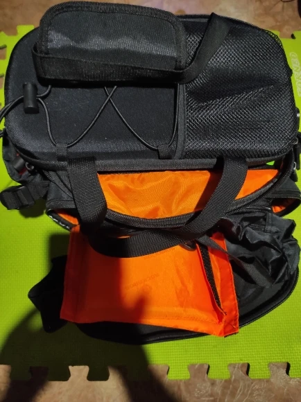 Посылка прибыла на почту спустя ~1,5 месяцев с момента заказа. Выглядит стильненько, качественно и прочно, материал водонепроницаемый. По размеру от таких сумок ждал большего, но видать они все примерно одинаковые такого объёма и их не делают слишком широкие, чтобы очень сильно выходило за габариты велосипеда по краям, и по длине чтобы не свисала с багажника с сзади, а так - футбольный мяч в центр залез ещё и место осталось ещё на пол мяча по длине и ширине и ещё сверху немного. Боковые карманы по - сути не функциональны, ибо там внутри идут откидные карманы мешки и в собранном состоянии они занимают почти всё пространство этих боковых карманов. В комплекте идёт плечевой ремешок и большой чехол от дождя.