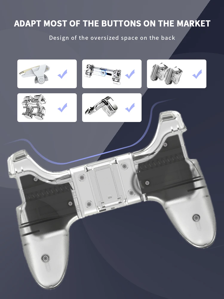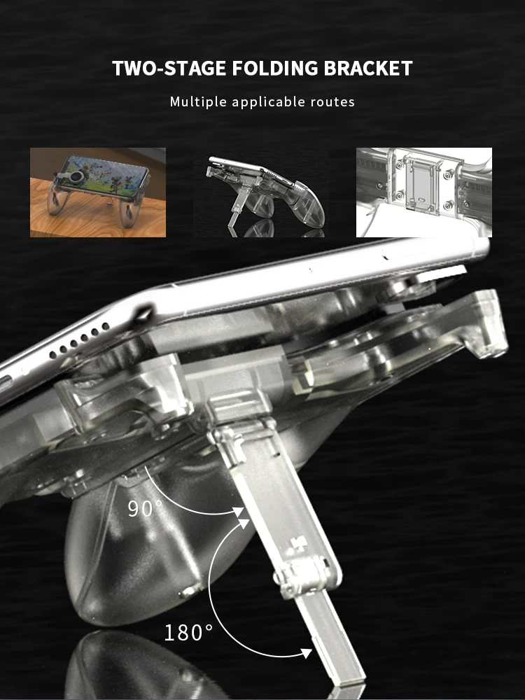 Два отдельных зажима для съемки, светильник и удобный, можно надежно закрепить на мобильный телефон, чтобы лучше всего помочь с микрооперациями, которые легко игнорируются ручным управлением. Они позволяют одновременно снимать с обеих сторон во время переключения углов. Триггер телефона имеет многоугольную регулируемую подставку, которая может использоваться в качестве подставки для телефона для просмотра фильмов или видео. Этот мобильный контроллер идеально подходит с 4,7-6,5 дюймового смартфона игровой контроллер.