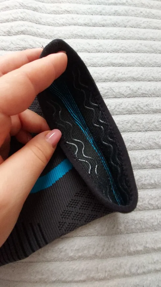 Взял два размера по таблице, М-ку и L-ку, на верхний обхват ноги 40-41см. Оба держатся нормально, плотно, разница между ними минимальная (внешне, 0.5 см в длину и ширину) и вообще не ощутимая на ноге. В остальном - всё как в описании, материал мягкий, плотный, сделано качественно. Не передавливает, по таблице можно смело подбирать, но мне подошёл и на размер больше.
