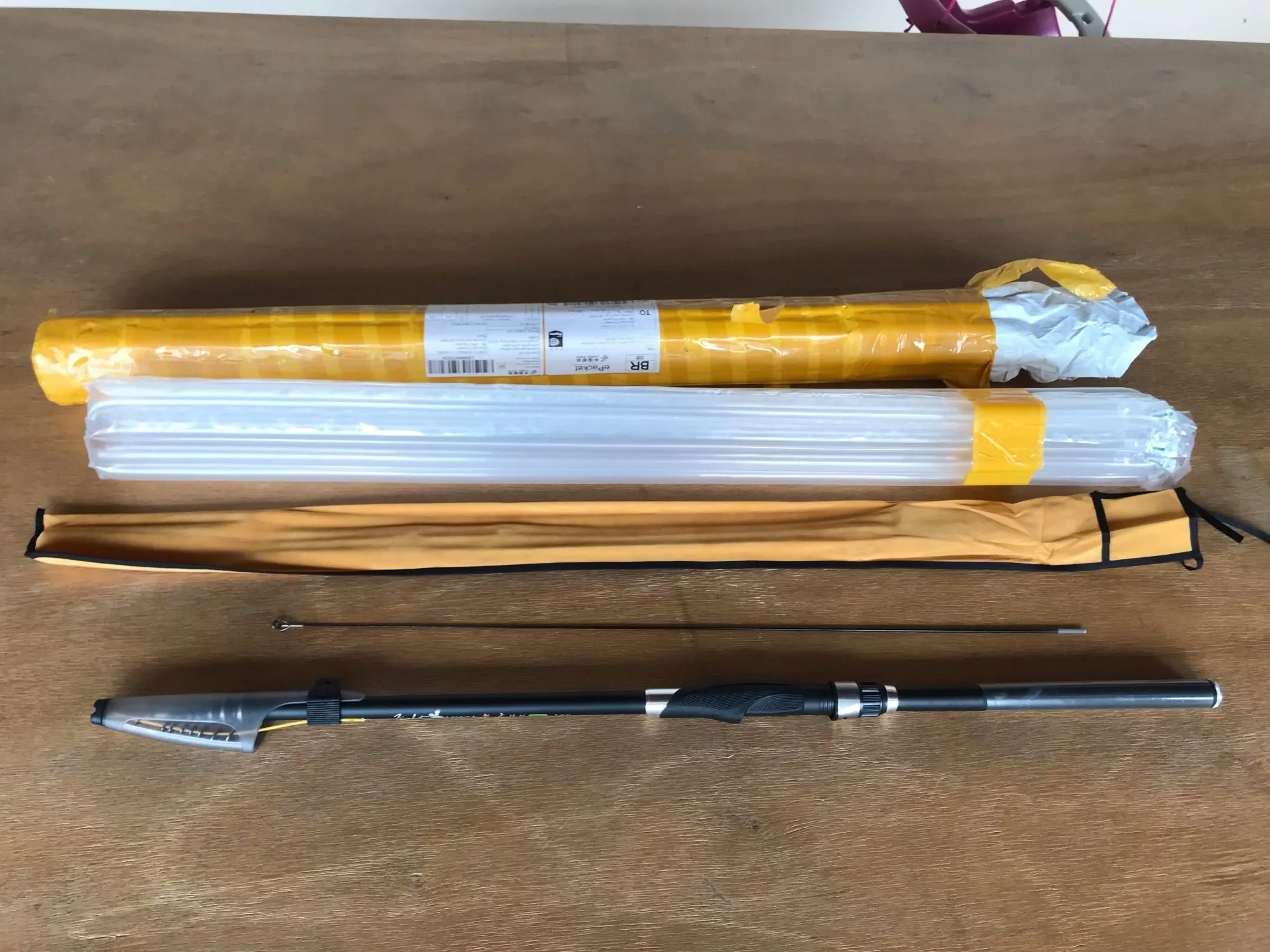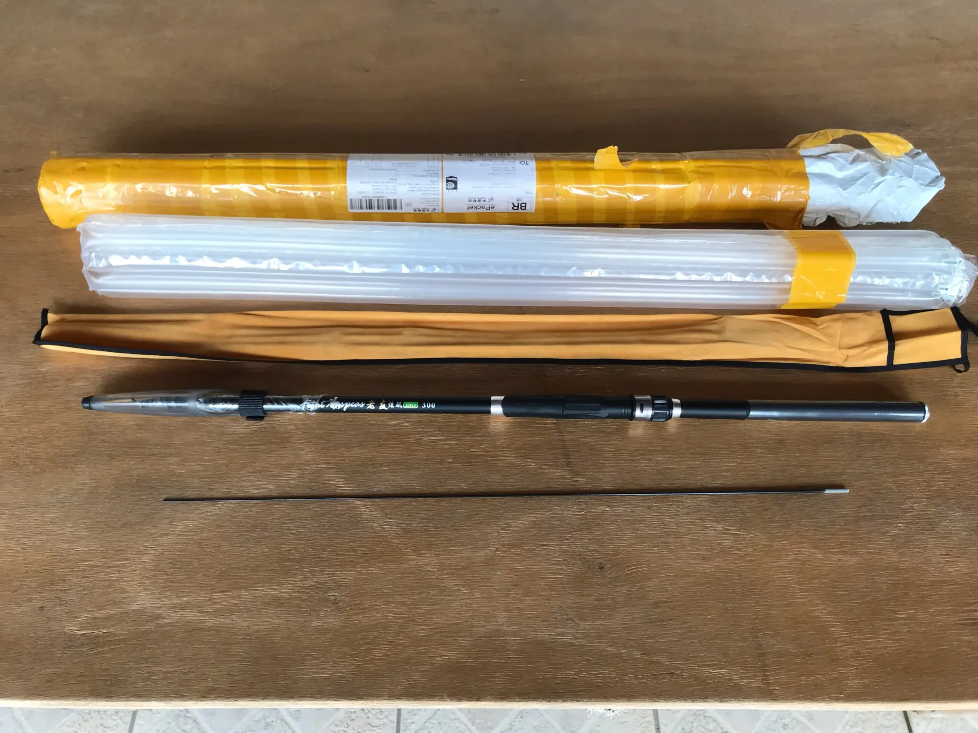 Пришло в целости в дутом пакете, внутри удочка в матерчатом чехле на завязках, запасная спица с кольцом, вытянуть удалось до 7 м, по весу легкая, пенал на торце, по виду сделано аккуратно, подпиливать нечего, рекомендую, надо тестить
