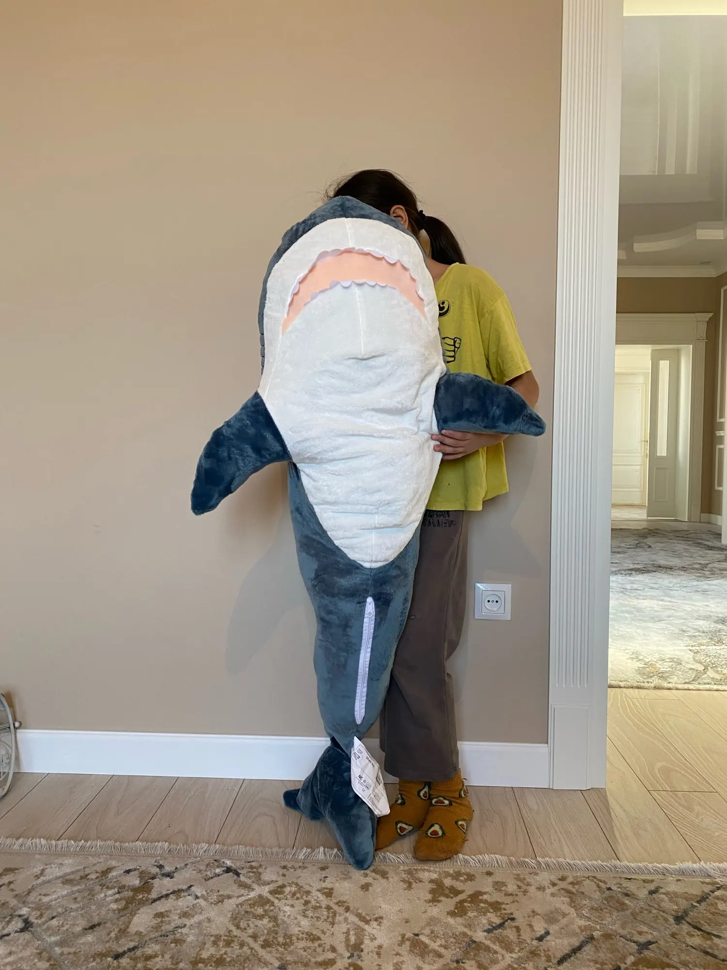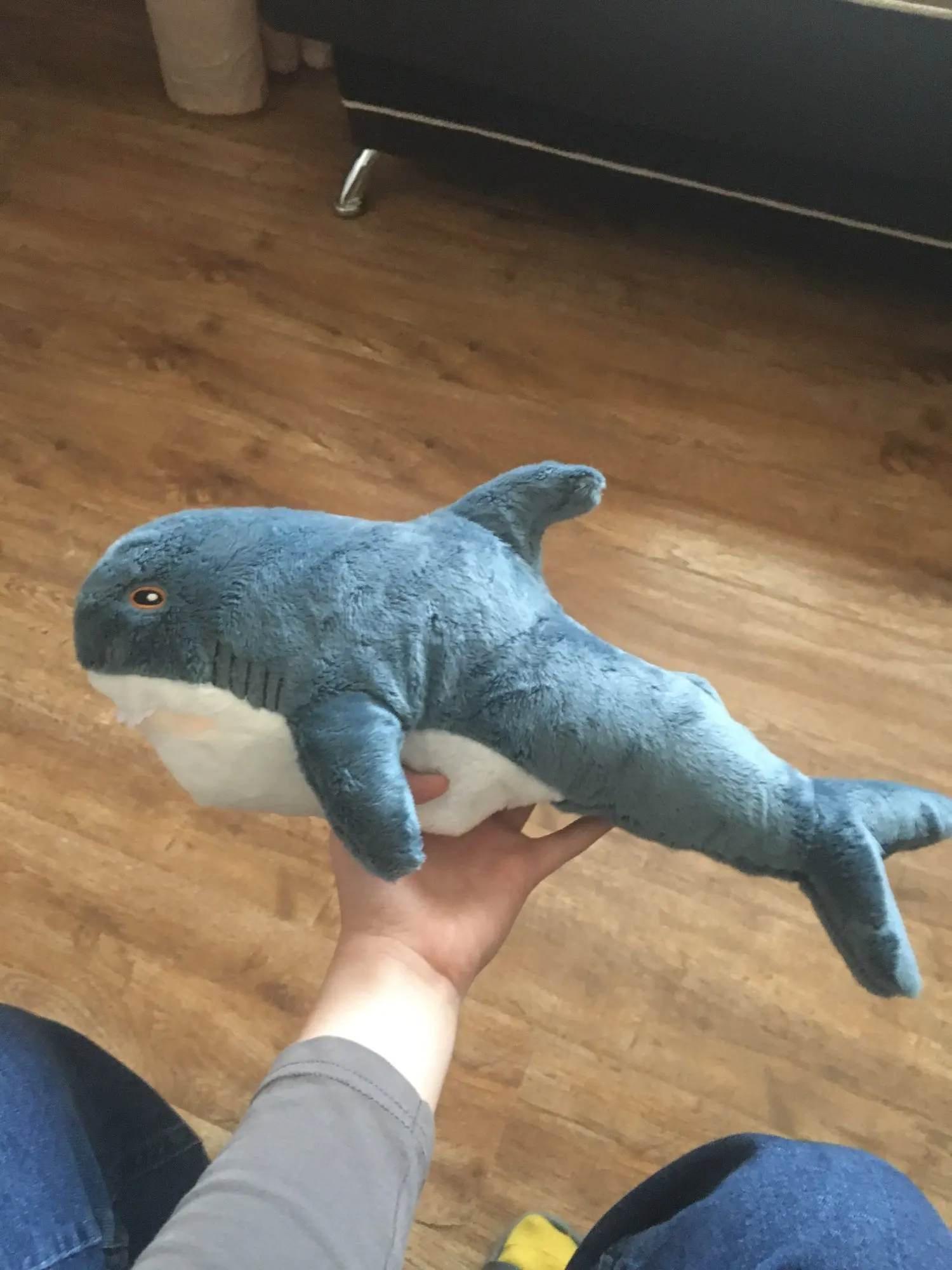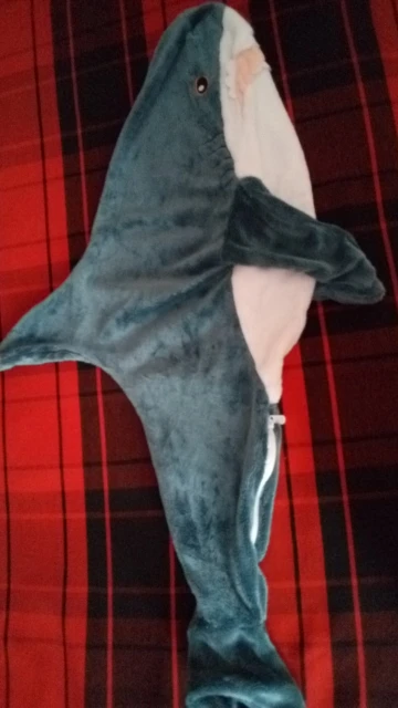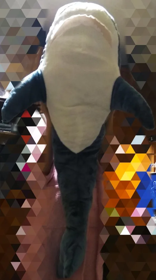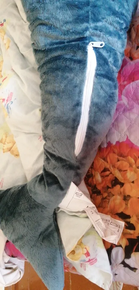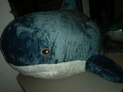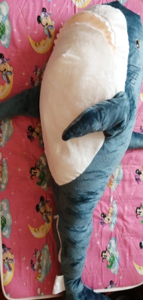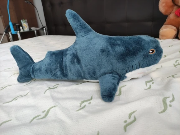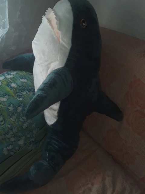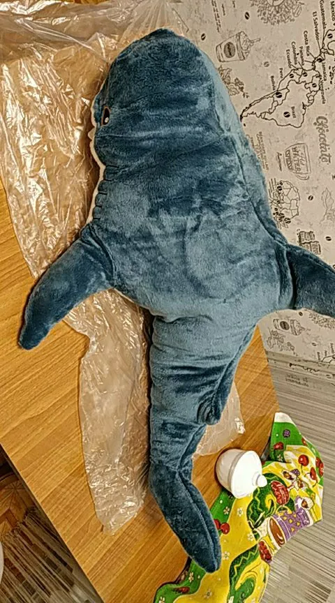 Продавец отправил заказ только через неделю (15 декабря) после заказа (8 декабря), но к новому году посылка успела. 30 декабря получили в постомате. Акула качественная, брюшко без замка (зашито). Набито не туго, но акула объемная, форму хорошо сохраняет. От икеи не отличить.