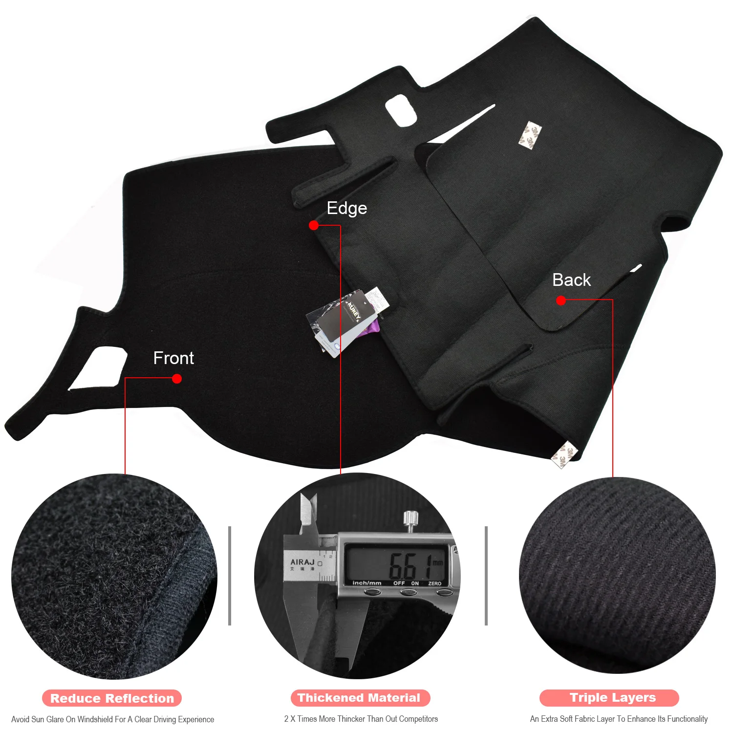 Простая установкаКонтуры для приборной панелиНе садится, не выцветает или не искажаетЗащищает приборную панель от ультрафиолетовых лучейУстраняет растрескиваниеУменьшает бликиУФ стабилизированная Высококачественная полиэфирная Автоматическая тканьДышит, чтобы рассеивать теплоБольшие вентиляционные вырезы, чтобы не ограничивать воздушный поток тумана