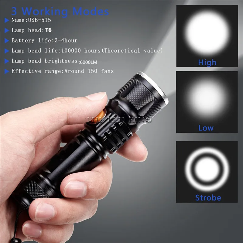 Фонарик T6 светодиодный с зарядкой по USB, 6000 лм, водонепроницаемый, алюминиевый