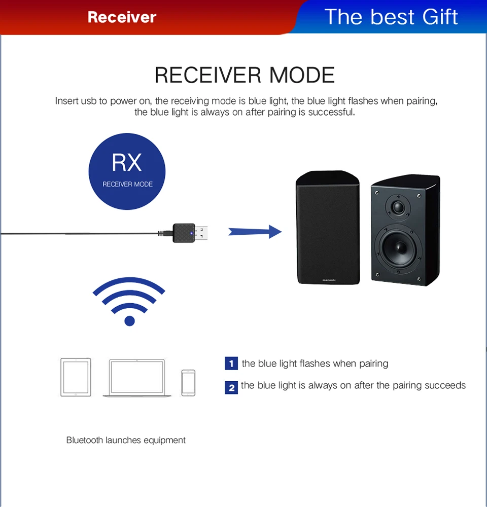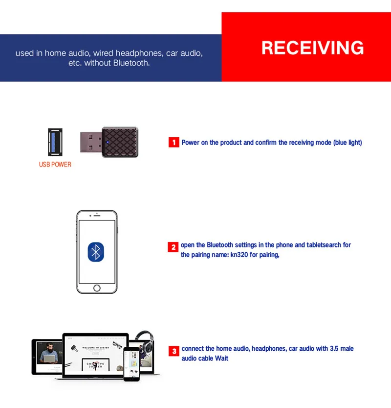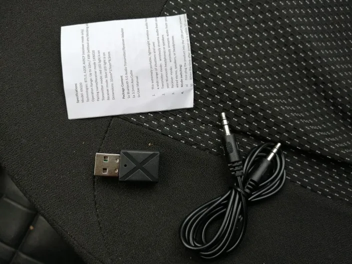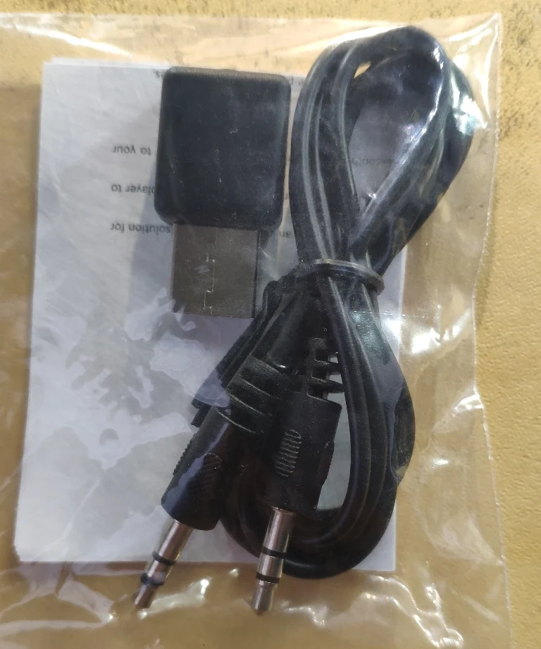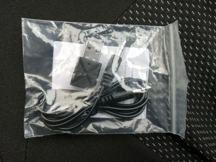 Пришло быстро. Упаковано в обычный пакет. В комплекте: usb-передатчик, провод Jack 3.5 папа-папа, инструкция. Покупал для подключения проэктора к саундбару - подключается, но потеря громкости ~98% (буду ковыряться, может исправлю). Перед покупкой задавал вопрос продавцу, но он так и не ответил. Дополню отзыв, если получится уменьшить потери