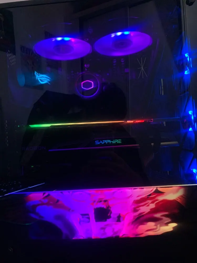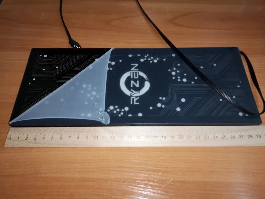 Товар шёл 25 дней до Спб(посылка не отслеживалась, пробивал через трекер Почты России по номеру). Все надёжно запаковано + наклеена защитная пленка, чтобы при установке не пачкать панель руками. Очень качественное нанесение рисунка. По сути вы можете заказать любое изображение, даже самому что-то надизайнить в PS. Всё ограничивается вашей фантазией и способностью донести что вы хотите) Просто делаете заказ и списываетесь с продавцом через чат(английский). Ему сообщаете размеры, рисунок и тип питания. Я себе взял на 4pin(12V). Всё отлично заработало и засинхрилось с MSI Mystic Light(ничего удивительного, ведь по сути это обычная RGB лента по принципу работы). Светится всеми цветами радуги(если мать и ПО позволяет, можете настраивать как вам вздумается, хоть одним цветом постоянно). Крепится на двухсторонний силиконовый скотч(в комплекте). Рекомендую, если думали приобрести что-то подобное для кастомизации корпуса. Выглядит красиво;)