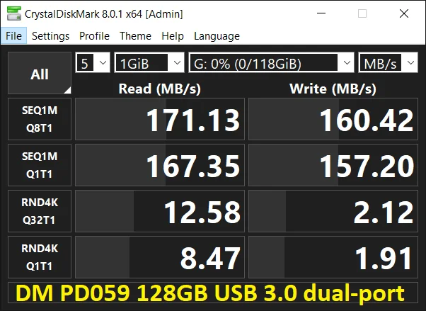 Металлический корпус и качество сборки превосходны. Я протестировал версию 128 ГБ. Как вы видите, впечатляющие скорости чтения/записи с помощью 'sequential '. Скорость чтения выше среднего. В то время как «случайные» скорости записи всего лишь достаточно. В реальном мире используются медленные случайные скорости записи уменьшают общую производительность по сравнению с аналогичной ценой Lexar USB 3,1 M45 Jumpdrive. Оба эти накопителя очень компактны (примерно от половины до четверти размера стандартного USB (type-a) флэш-накопителя. Но отличительной чертой этого накопителя DM является дополнительный порт USB-C. Оба являются обновлением от SanDisk накопителей стоимостью под $35 (не Pro, не USB 3,1). Поэтому, если вы покупаете компактный металлический привод для ежедневного использования, то получите Lexar за его скорость. Если для двухпортового, компактного, металлического привода для гибкого использования, то получите этот диск DM. Если вы покупаете на данный момент самый быстрый диск в этом ценовом диапазоне $20 $22, то получите двойной порт Vansuny 128GB USB3.1 (silver U21 с JMicron Tech контроллером).