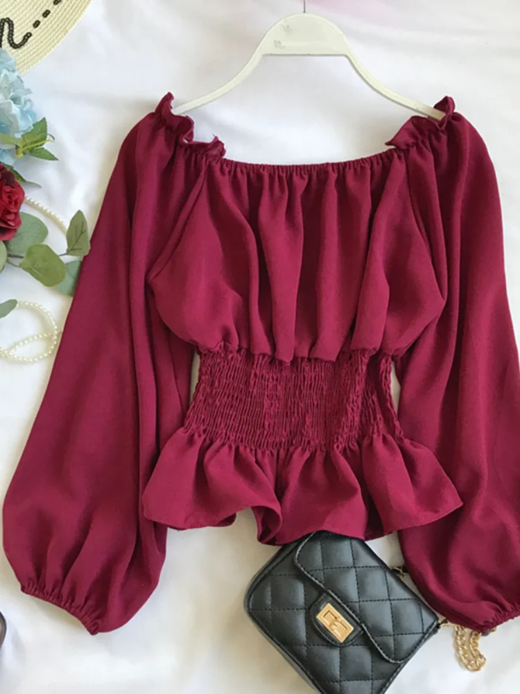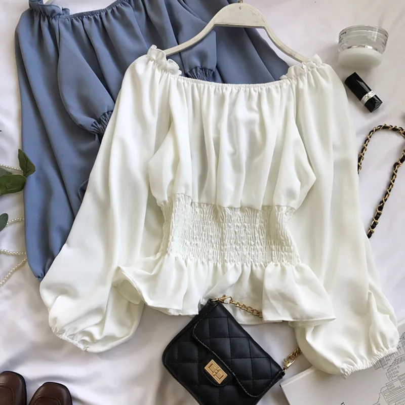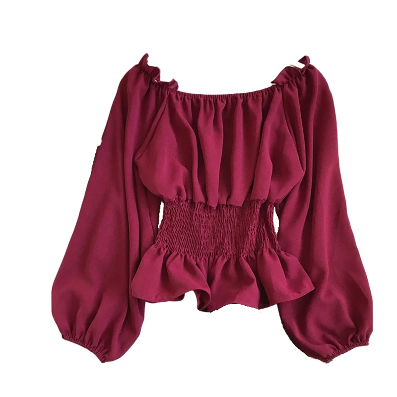Лето 2022, новинка, шифоновая женская блузка и рубашки с рукавами-фонариками, однотонные, тонкие, сексуальные, с вырезом лодочкой, с оборками, женские рубашки, верхняя одежда, топы
