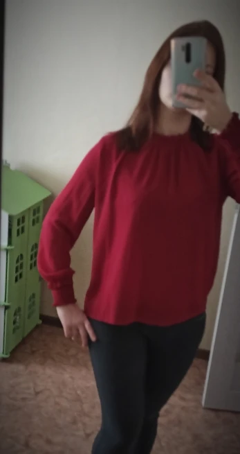 Блузка пришла где-то через месяц. Упакована была в обычный пакет. Размер на месяц свободно, нигде не тянет и рукава не короткие. Мои параметры: рост 170, вес 66, ОГ89 ОТ75, ОБ102. Сама кофта по качеству нормальная, все швы аккуратные, ну пару ниточек торчат. Цвет кофты действительно винный, на моем фото он смотрится светлее. За 600 руб. хорошая кофточка, не пожалела что взяла.