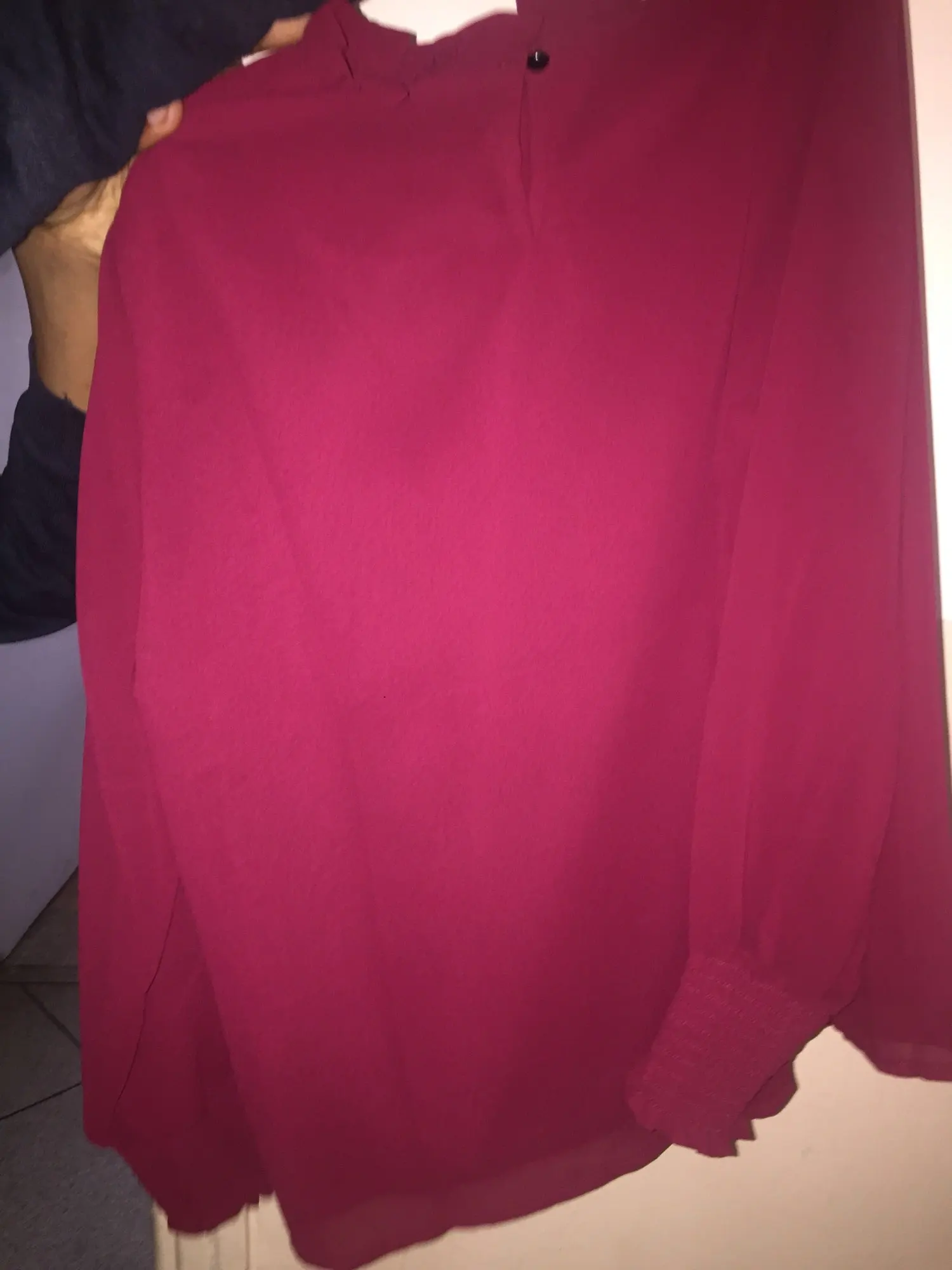 Sehr schöne Bluse. Stoff fühlt sich gut an und die Bluse sitzt wir auf dem Foto. (Maße: Brust 102/ Taille 80/ Hüfte 107)