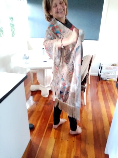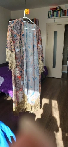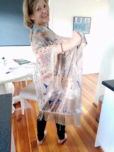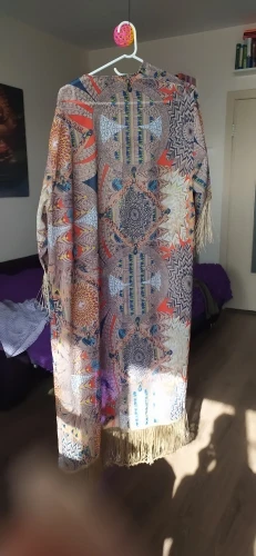 Очень быстрая доставка! 9 дней до Москвы. Халат ровно как на фото. Брак не нашла, запаха нет. Ткань приятная, полупрозрачная, но плотная - не мнётся. Бахрома на рукавах и подоле снизу была собрана тисёмкой. Как я понимаю, для того, чтоб не путались веревочки-сняла ее. Носить собираюсь дома, как халат. На талию 65см - есть запах - удобно. Халат красивый!