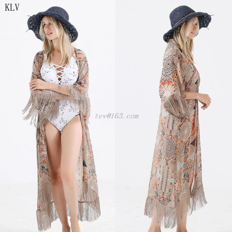 Шифоновый кардиган-кимоно в стиле ретро, с коротким рукавом, кисточками и бахромой, накидка для бикини до щиколотки, пляжный купальник, 2021