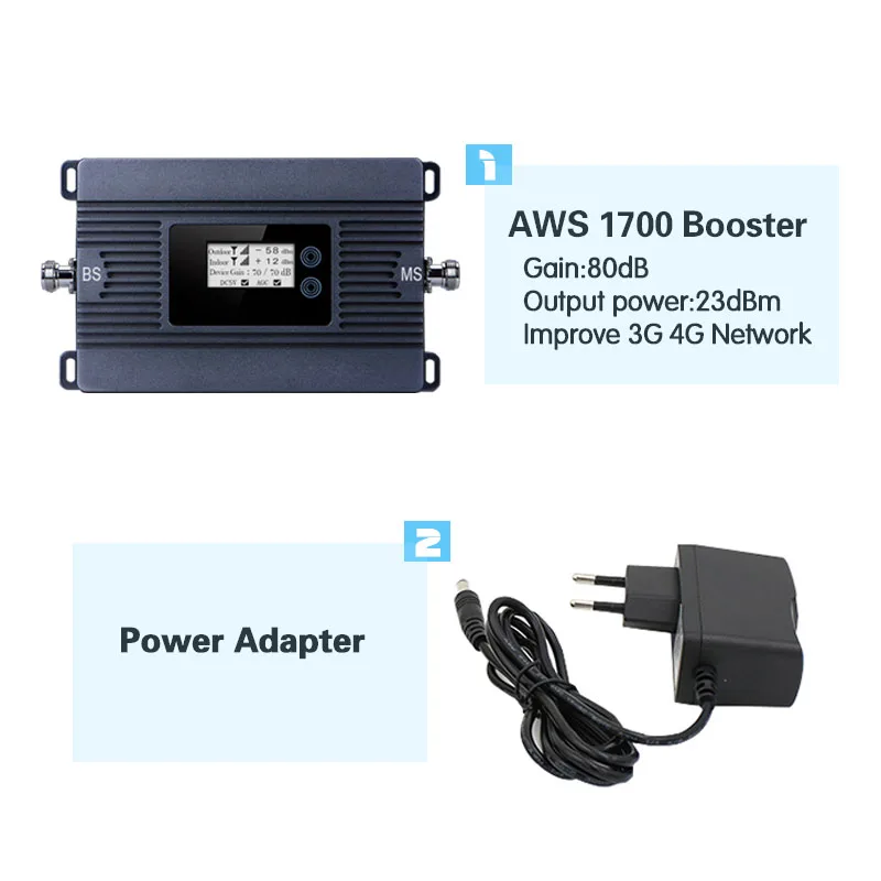 1. Усилитель сигнала 3g 4g AWS 1700 МГц2. Вилка питания.☆☆ Пожалуйста, обратите внимание, что этот продукт не включает антенны и кабель, пожалуйста, покупайте отдельно, если они вам нужны. ☆☆
