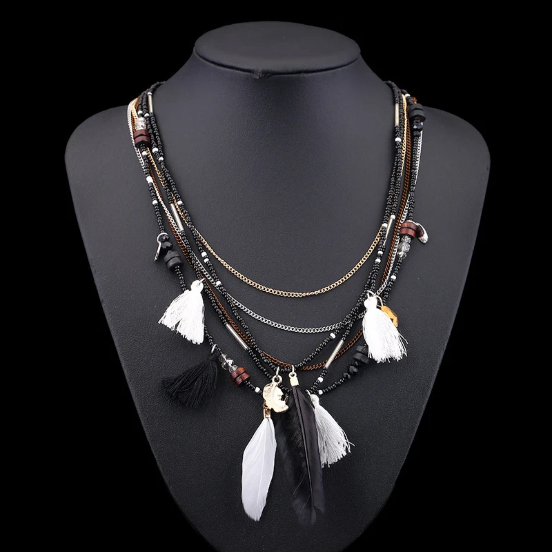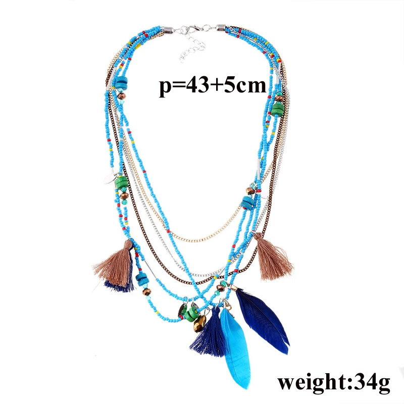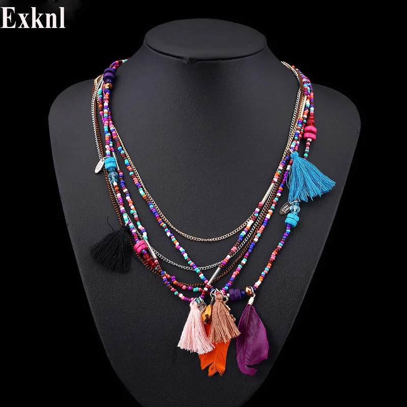 Женское богемное ожерелье Exknl с перьями, длинная Этническая цепочка с бусинами и кисточками, массивное ожерелье