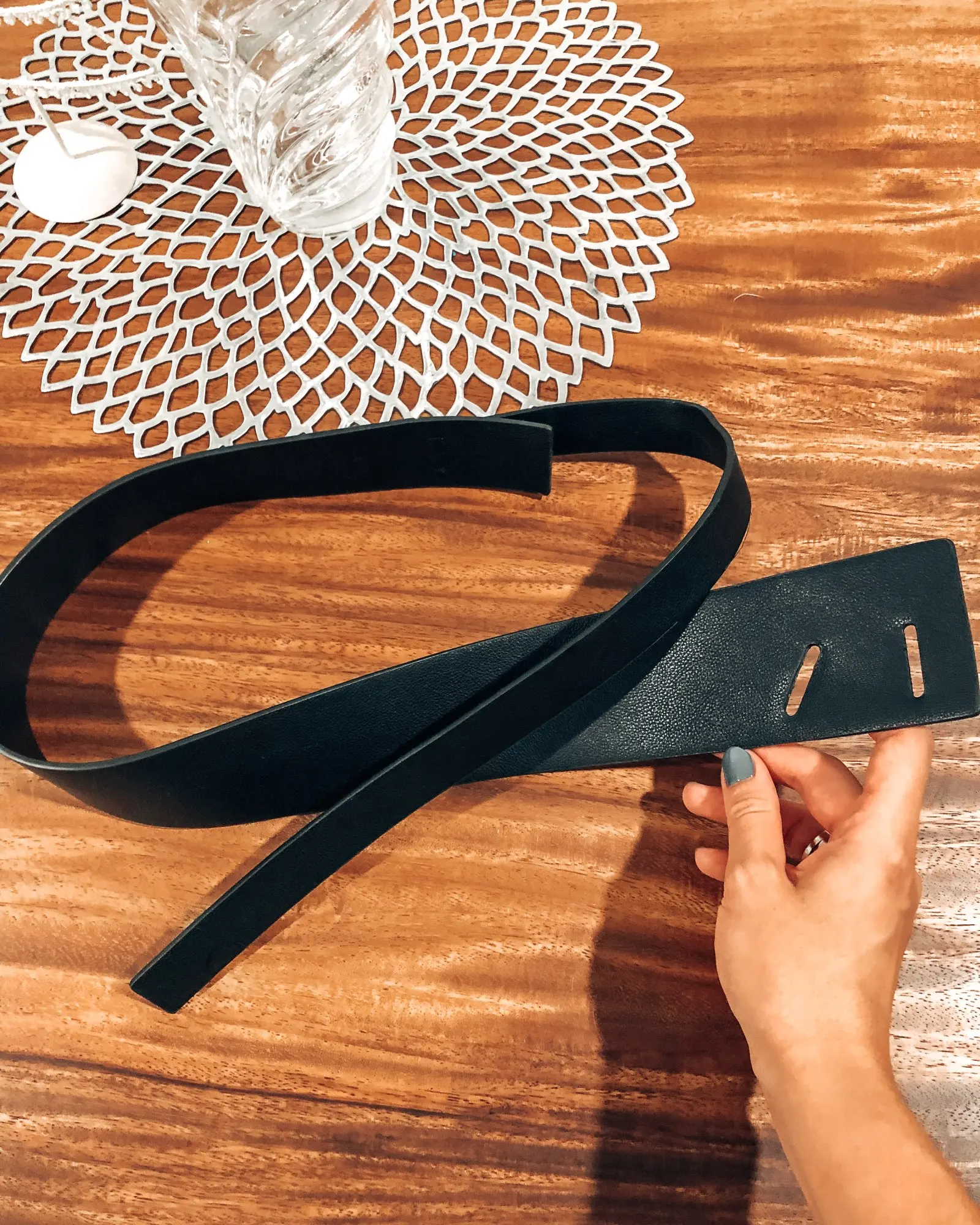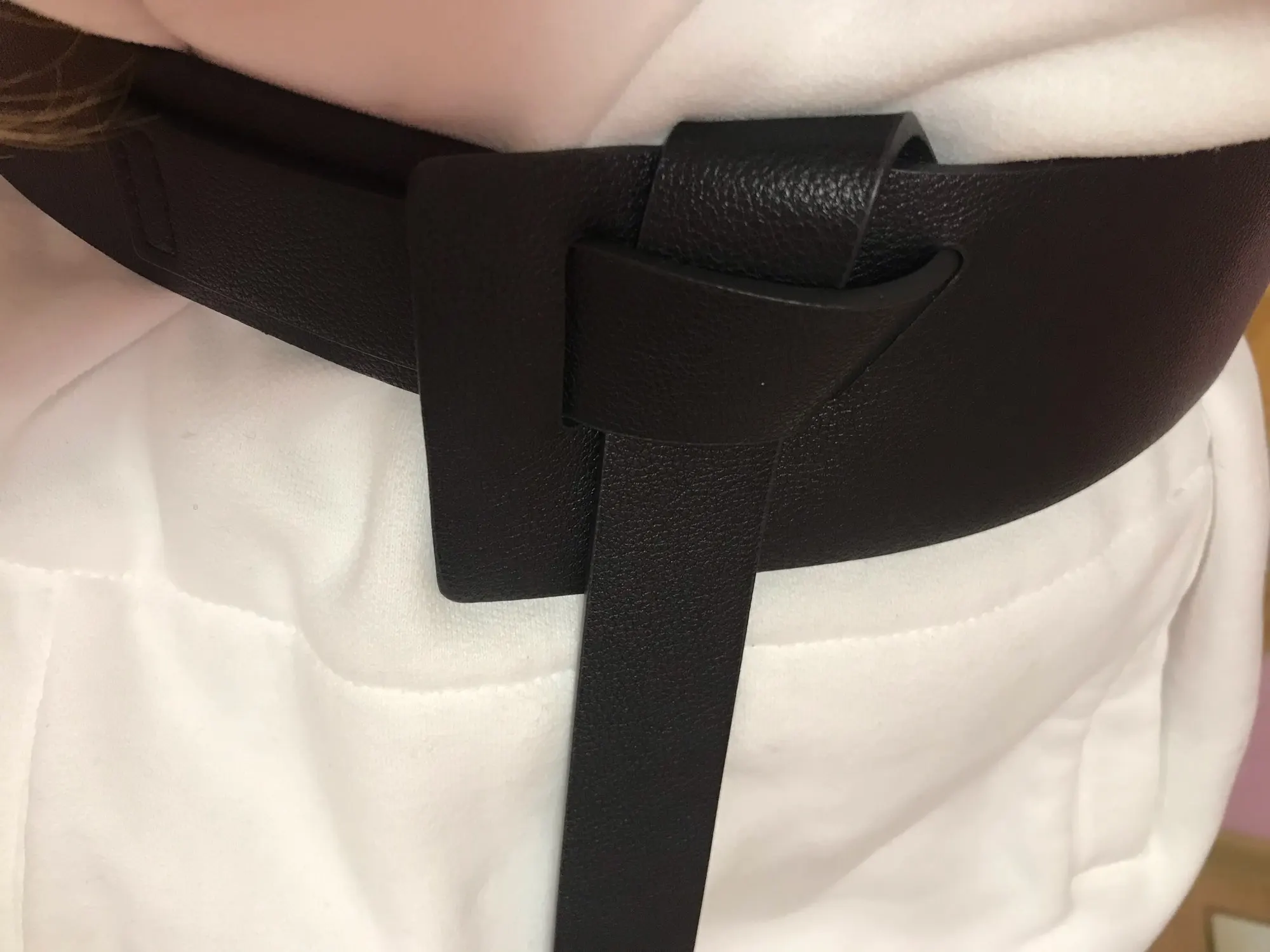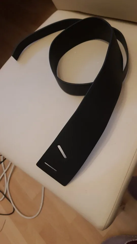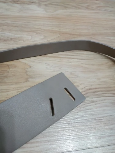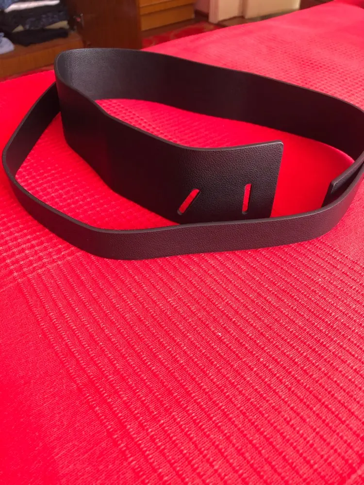 На размер ОТ 79см ремень маловат. Но носить его можно, но его геометрия такова, что мне понятно, что он должен сидеть немного иначе. Представляет собой полосу кожзаменителя разной ширины, с прорезями с одной стороны.