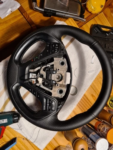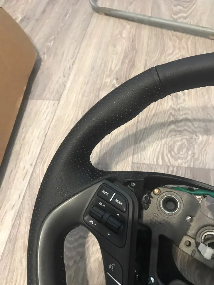 Всем привет, дошло за 3 недели до СПБ, село замечательно, снимал руль и пластик, родную оплетку не снимал, так руль крупнее и приятней для меня, но в этом есть минус: чуть дольше нагрев идёт, материал толще получается. Есть один косяк, сзади не хватает кусочка кожи, буквально 5мм, не вся идёт под кожух, но если не присматриваться и не знать, то и не заметно(2е фото). Продавец идёт на контакт, увидел косяк и сразу выслал другую. Не жалейте липкую ленту, особенно с боков на лучах возле кнопок(3е фото), так что в принципе 5-))