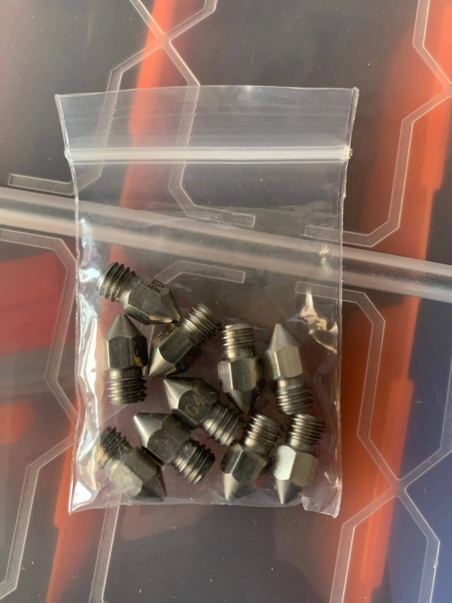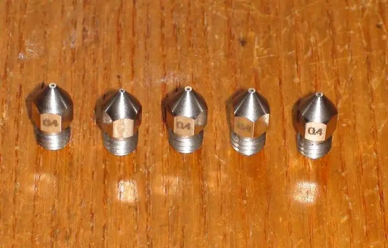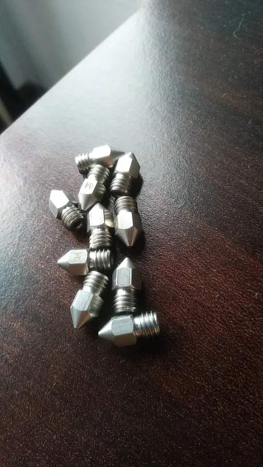 Разный диаметр отверстий на 2-х заказанных 0.4мм Проволока для прочистки (диаметр 0.4 мм) в одно сопло не входит, в другое проходит слишком свободно. Отверстия не совсем по центру Сопло 0.2мм проверить нечем, надеюсь все точно, на просвет видно.