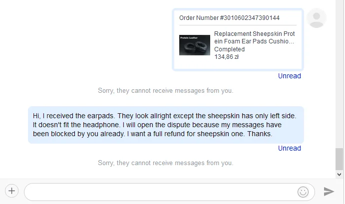 Я купил 2 пары (по одному от каждого) и получил амбушюры. Они выглядят хорошо, за исключением того, что овечья кожа имеет только левую сторону. Он не подходит для наушников и не симметричен. Мои сообщения были заблокированы продавцом. Я не могу до них дойти. Я запросил полный возврат средств за один из овчины. Вот доказательства с фотографиями и сравнения.