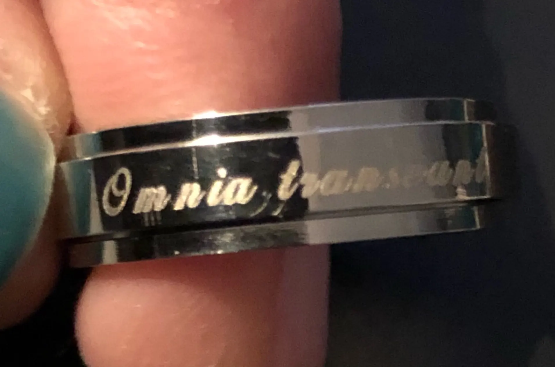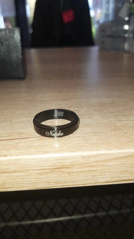 ЭТО ЧУДО-ПРОДАВЕЦ, КОТОРЫЙ ДЕЛАЕТ АБСОЛЮТНО ЗАМЕЧАТЕЛЬНЫЕ ВЕЩИ Продавец отзывчивый, без проблем взялся за гравировку. Уже через сутки отправление было уже в пути. И первое, что хочется отметить, это супер быстрая доставка - всего 11 дней до МСК. Кольцо было упаковано в плотный конверт и бархатный мешочек. Касательно деталей, заказывалось чёрное кольцо с серебряной гравировкой - надпись на русском языке И с уверенностью хочу сказать, что продавец выполнил всё идеально и не чуть не подвёл! Никаких слитных или неправильно написанных слов, чёткие буквы. Возможно, что нельзя сделать шрифт каким-то вычурным или выбрать форму, но от этого оно выглядит ничуть не хуже. Размер измерялся описанным на сайте способом, и, конечно же, хочется отметить полное соответствие таблице. Но всё же, делая заказ, следует обращать внимание на такие немаловажные детали как отчётность рук или же размер суставов, саму форму пальцев, дабы не прогадать. Средняя часть кольца прокручивается