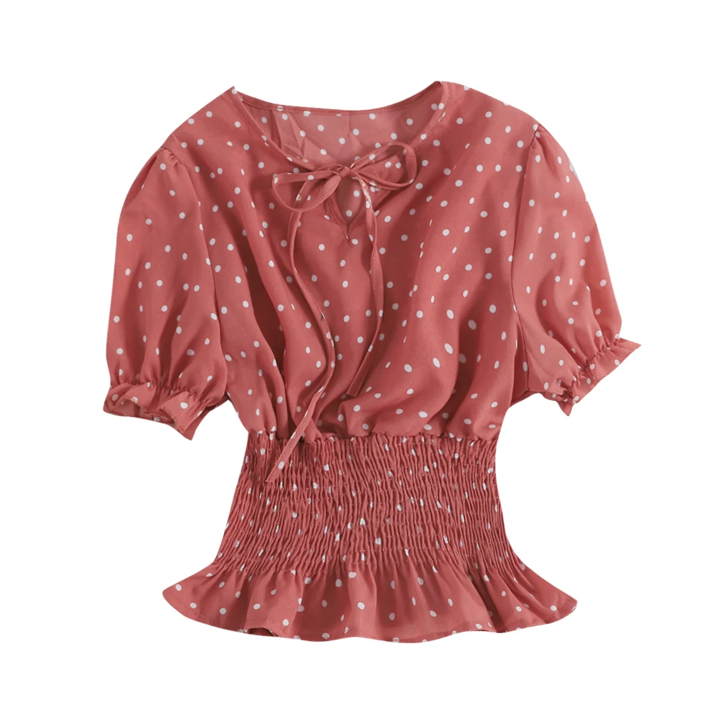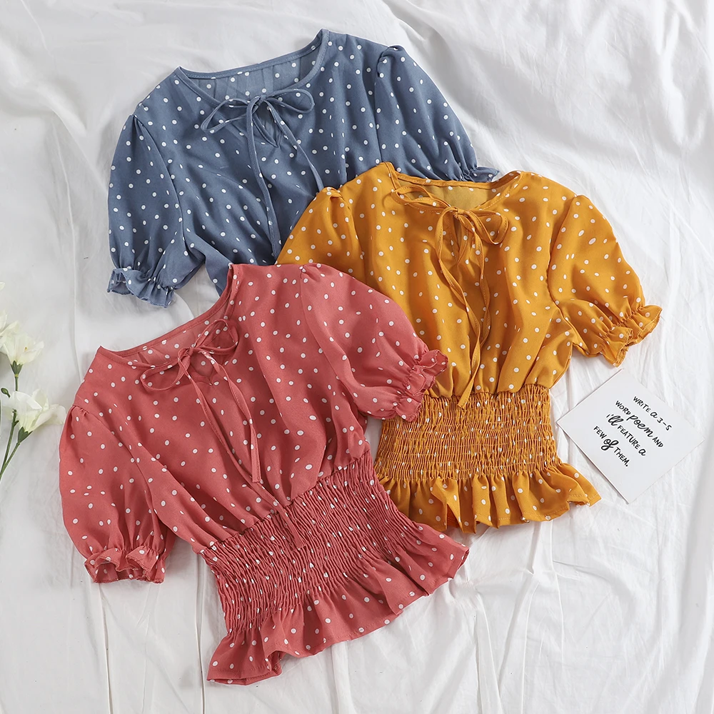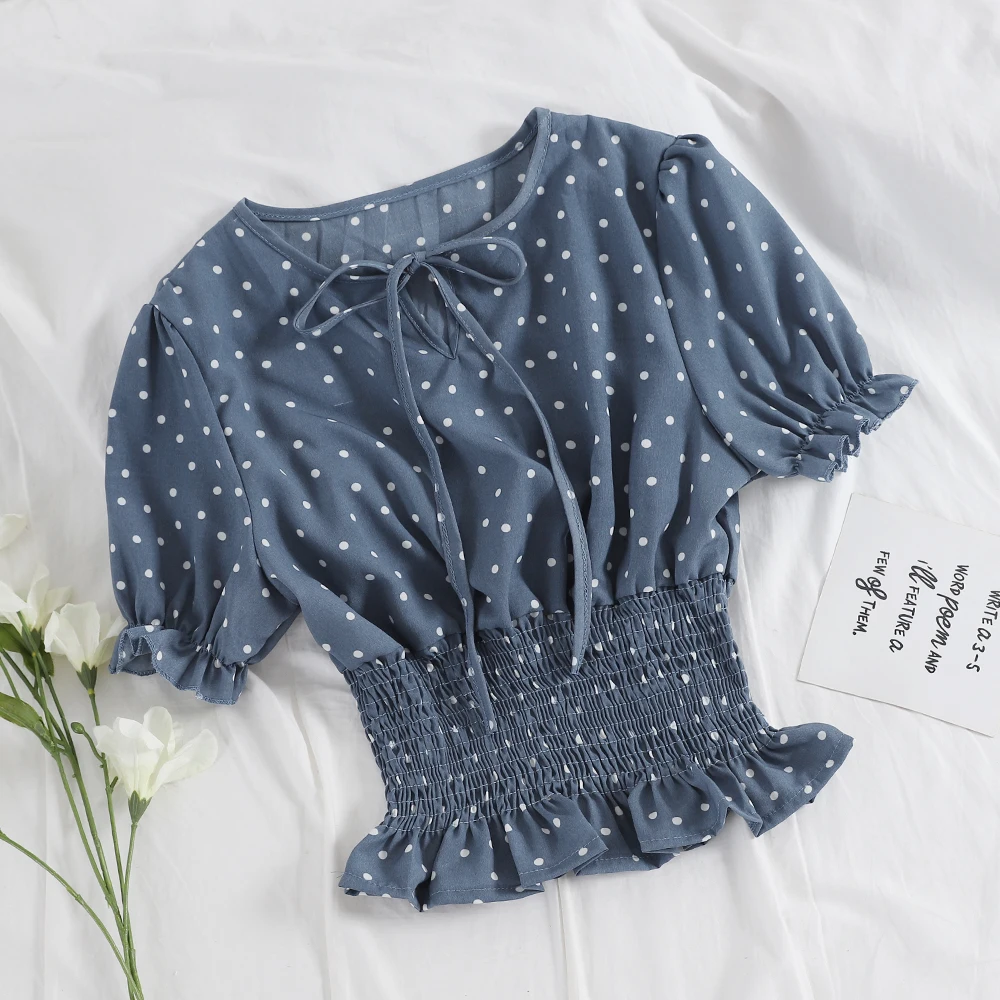 Женская шифоновая блузка в горошек, винтажная короткая облегающая блузка на завязках с высокой талией и оборками, лето 2019