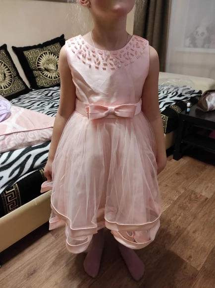 Шикарное платье за такие деньги. Соответствует описанию. Пошито качественно, было пару ниток, но они просто прилипли к фатину, убрали и все. Ребёнок просто в восторге.